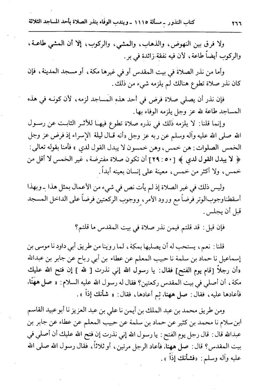 فَإِنْ نَذَرَ أَنْ يُصَلِّيَ صَلَاةَ فَرْضٍ فِي أَحَدِ هَذِهِ الْمَسَاجِدِ لَزِمَهُ؛ لِأَنَّ كَوْنَهُ فِي هَذِهِ الْمَسَاجِدِ طَاعَةٌ لِلَّهِ عَزَّ وَجَلَّ يَلْزَمُهُ الْوَفَاءُ بِهَا. وَإِنَّمَا قُلْنَا: لَا يَلْزَمُهُ ذَلِكَ فِي نَذْرِهِ صَلَاةَ تَطَوُّعٍ فِيهَا لِلْأَثَرِ الثَّابِتِ «عَنْ رَسُولِ اللَّهِ - صَلَّى اللَّهُ عَلَيْهِ وَآلِهِ وَسَلَّمَ - عَنْ رَبِّهِ - عَزَّ وَجَلَّ - أَنَّهُ قَالَ لَيْلَةَ الْإِسْرَاءِ إذْ فَرَضَ - عَزَّ وَجَلَّ - الْخَمْسَ الصَّلَوَاتِ: هُنَّ خَمْسٌ، وَهُنَّ خَمْسُونَ مَا يُبَدَّلُ الْقَوْلُ لَدَيَّ» فَآمَنَّا بِقَوْلِهِ تَعَالَى: {مَا يُبَدَّلُ الْقَوْلُ لَدَيَّ} [ق: 29] أَنْ تَكُونَ صَلَاةً مُفْتَرَضَةً، غَيْرَ الْخَمْسِ لَا أَقَلَّ مِنْ خَمْسٍ، وَلَا أَكْثَرَ مِنْ خَمْسٍ، مُعَيَّنَةً عَلَى إنْسَانٍ بِعَيْنِهِ أَبَدًا.