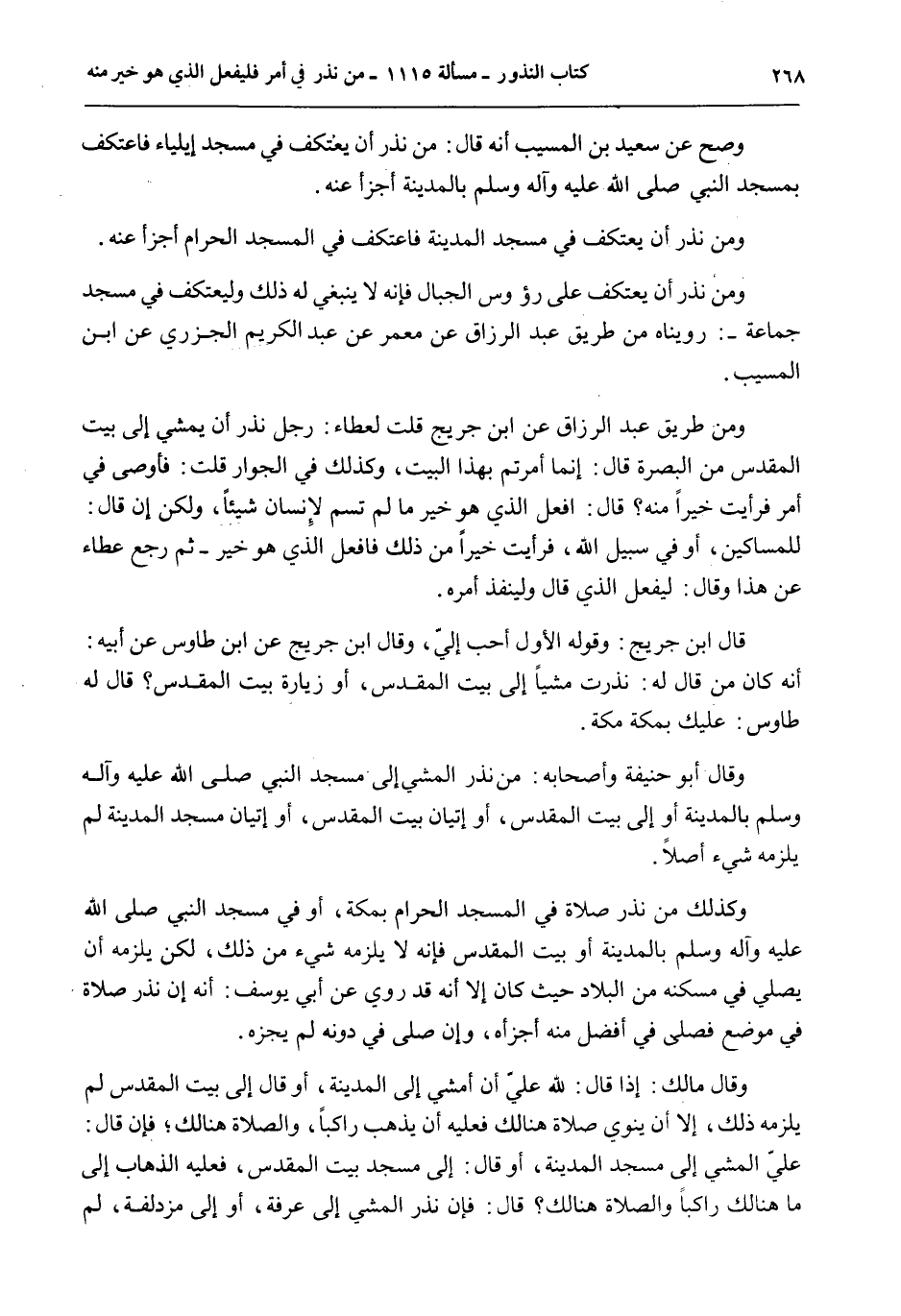 وَصَحَّ عَنْ سَعِيدِ بْنِ الْمُسَيِّبِ أَنَّهُ قَالَ: مَنْ نَذَرَ أَنْ يَعْتَكِفَ فِي مَسْجِدِ إيلْيَاءَ فَاعْتَكَفَ بِمَسْجِدِ النَّبِيِّ - صَلَّى اللَّهُ عَلَيْهِ وَآلِهِ وَسَلَّمَ - بِالْمَدِينَةِ أَجْزَأَ عَنْهُ. وَمَنْ نَذَرَ أَنْ يَعْتَكِفَ فِي مَسْجِدِ الْمَدِينَةِ فَاعْتَكَفَ فِي الْمَسْجِدِ الْحَرَامِ أَجْزَأَ عَنْهُ. وَمَنْ نَذَرَ أَنْ يَعْتَكِفَ عَلَى رُءُوسِ الْجِبَالِ فَإِنَّهُ لَا يَنْبَغِي لَهُ ذَلِكَ وَلْيَعْتَكِفْ فِي مَسْجِدِ جَمَاعَةٍ -: