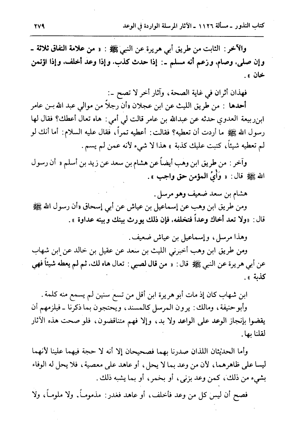 وَأَبُو حَنِيفَةَ، وَمَالِكٌ: يَرَوْنَ الْمُرْسَلَ كَالْمُسْنَدِ، وَيَحْتَجُّونَ بِمَا ذَكَرْنَا - فَيَلْزَمُهُمْ أَنْ يَقْضُوا بِإِنْجَازِ الْوَعْدِ عَلَى الْوَاعِدِ وَلَا بُدَّ، وَإِلَّا فَهُمْ مُتَنَاقِضُونَ، فَلَوْ صَحَّتْ هَذِهِ الْآثَارُ لَقُلْنَا بِهَا.