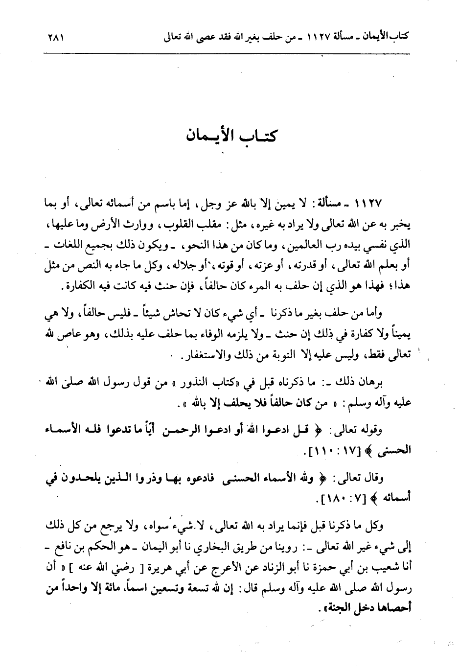 ِ 1127 - مَسْأَلَةٌ: لَا يَمِينَ إلَّا بِاَللَّهِ عَزَّ وَجَلَّ، إمَّا بِاسْمٍ مِنْ أَسْمَائِهِ تَعَالَى، أَوْ بِمَا يُخْبِرُ بِهِ عَنْ اللَّهِ تَعَالَى وَلَا يُرَادُ بِهِ غَيْرُهُ، مِثْلَ: مُقَلِّبِ الْقُلُوبِ، وَوَارِثِ الْأَرْضِ وَمَا عَلَيْهَا، الَّذِي نَفْسِي بِيَدِهِ رَبِّ الْعَالَمِينَ، وَمَا كَانَ مِنْ هَذَا النَّحْوِ، - وَيَكُونُ ذَلِكَ بِجَمِيعِ اللُّغَاتِ - أَوْ بِعِلْمِ اللَّهِ تَعَالَى، أَوْ قُدْرَتِهِ، أَوْ عِزَّتِهِ، أَوْ قُوَّتِهِ، أَوْ جَلَالِهِ، وَكُلِّ مَا جَاءَ بِهِ النَّصُّ مِنْ مِثْلِ هَذَا؛ فَهَذَا هُوَ الَّذِي إنْ حَلَفَ بِهِ الْمَرْءُ كَانَ حَالِفًا، فَإِنْ حَنِثَ فِيهِ كَانَتْ فِيهِ الْكَفَّارَةُ.