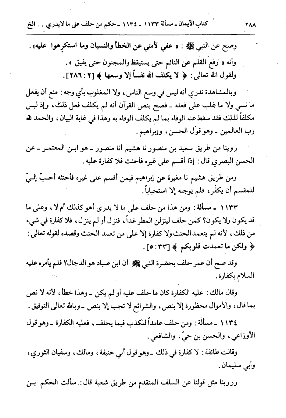 1133 - مَسْأَلَةٌ: وَمِنْ هَذَا مَنْ حَلَفَ عَلَى مَا لَا يَدْرِي أَهْوَ كَذَلِكَ أَمْ لَا، وَعَلَى مَا قَدْ يَكُونُ وَلَا يَكُونُ؟ كَمَنْ حَلَفَ لَيَنْزِلَنَّ الْمَطَرُ غَدًا، فَنَزَلَ أَوْ لَمْ يَنْزِلْ، فَلَا كَفَّارَةَ فِي شَيْءٍ مِنْ ذَلِكَ؛ لِأَنَّهُ لَمْ يَتَعَمَّدْ الْحِنْثَ وَلَا كَفَّارَةَ إلَّا عَلَى مَنْ تَعَمَّدَ الْحِنْثَ وَقَصَدَهُ لِقَوْلِهِ تَعَالَى: {وَلَكِنْ مَا تَعَمَّدَتْ قُلُوبُكُمْ} [الأحزاب: 5] .