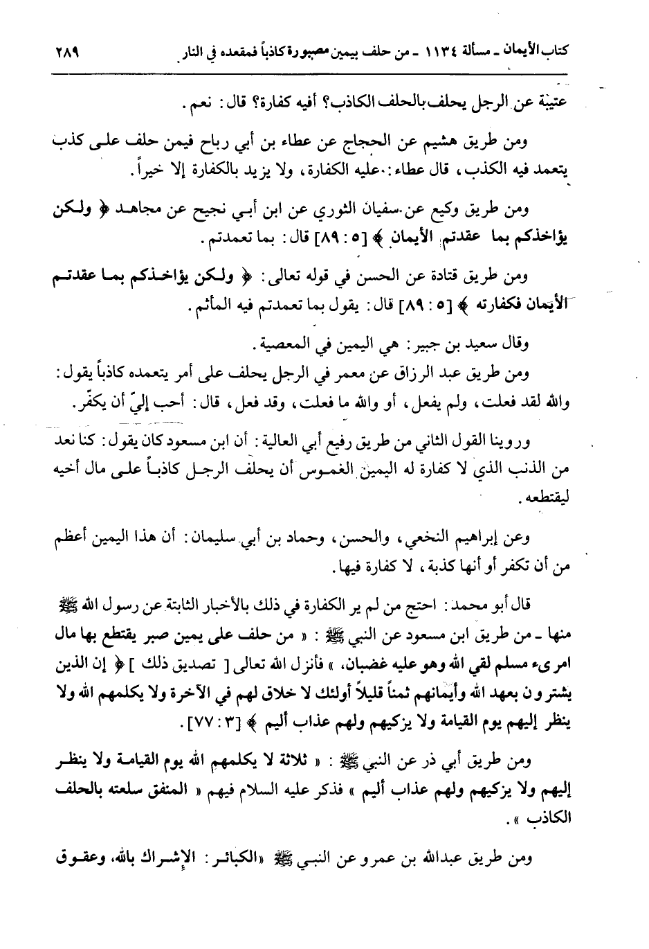 قَالَ أَبُو مُحَمَّدٍ: احْتَجَّ مَنْ لَمْ يَرَ الْكَفَّارَةَ فِي ذَلِكَ بِالْأَخْبَارِ الثَّابِتَةِ عَنْ رَسُولِ اللَّهِ - صَلَّى اللَّهُ عَلَيْهِ وَسَلَّمَ - مِنْهَا - مِنْ طَرِيقِ ابْنِ مَسْعُودٍ عَنْ النَّبِيِّ - صَلَّى اللَّهُ عَلَيْهِ وَسَلَّمَ -: «مَنْ حَلَفَ عَلَى يَمِينِ صَبْرٍ يَقْتَطِعُ بِهَا مَالَ امْرِئٍ مُسْلِمٍ لَقِيَ اللَّهَ وَهُوَ عَلَيْهِ غَضْبَانُ» فَأَنْزَلَ اللَّهُ تَعَالَى تَصْدِيقَ ذَلِكَ {إِنَّ الَّذِينَ يَشْتَرُونَ بِعَهْدِ اللَّهِ وَأَيْمَانِهِمْ ثَمَنًا قَلِيلا أُولَئِكَ لا خَلاقَ لَهُمْ فِي الآخِرَةِ وَلا يُكَلِّمُهُمُ اللَّهُ وَلا يَنْظُرُ إِلَيْهِمْ يَوْمَ الْقِيَامَةِ وَلا يُزَكِّيهِمْ وَلَهُمْ عَذَابٌ أَلِيمٌ} [آل عمران: 77] .