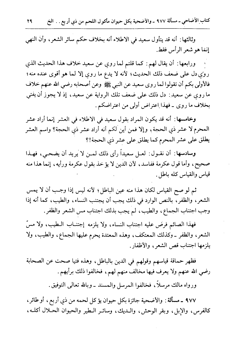 977 - مَسْأَلَةٌ: وَالْأُضْحِيَّةُ جَائِزَةٌ بِكُلِّ حَيَوَانٍ يُؤْكَلُ لَحْمُهُ مِنْ ذِي أَرْبَعٍ، أَوْ طَائِرٍ، كَالْفَرَسِ، وَالْإِبِلِ، وَبَقَرِ الْوَحْشِ، وَالدِّيكِ، وَسَائِرِ الطَّيْرِ وَالْحَيَوَانِ الْحَلَالِ أَكْلُهُ،