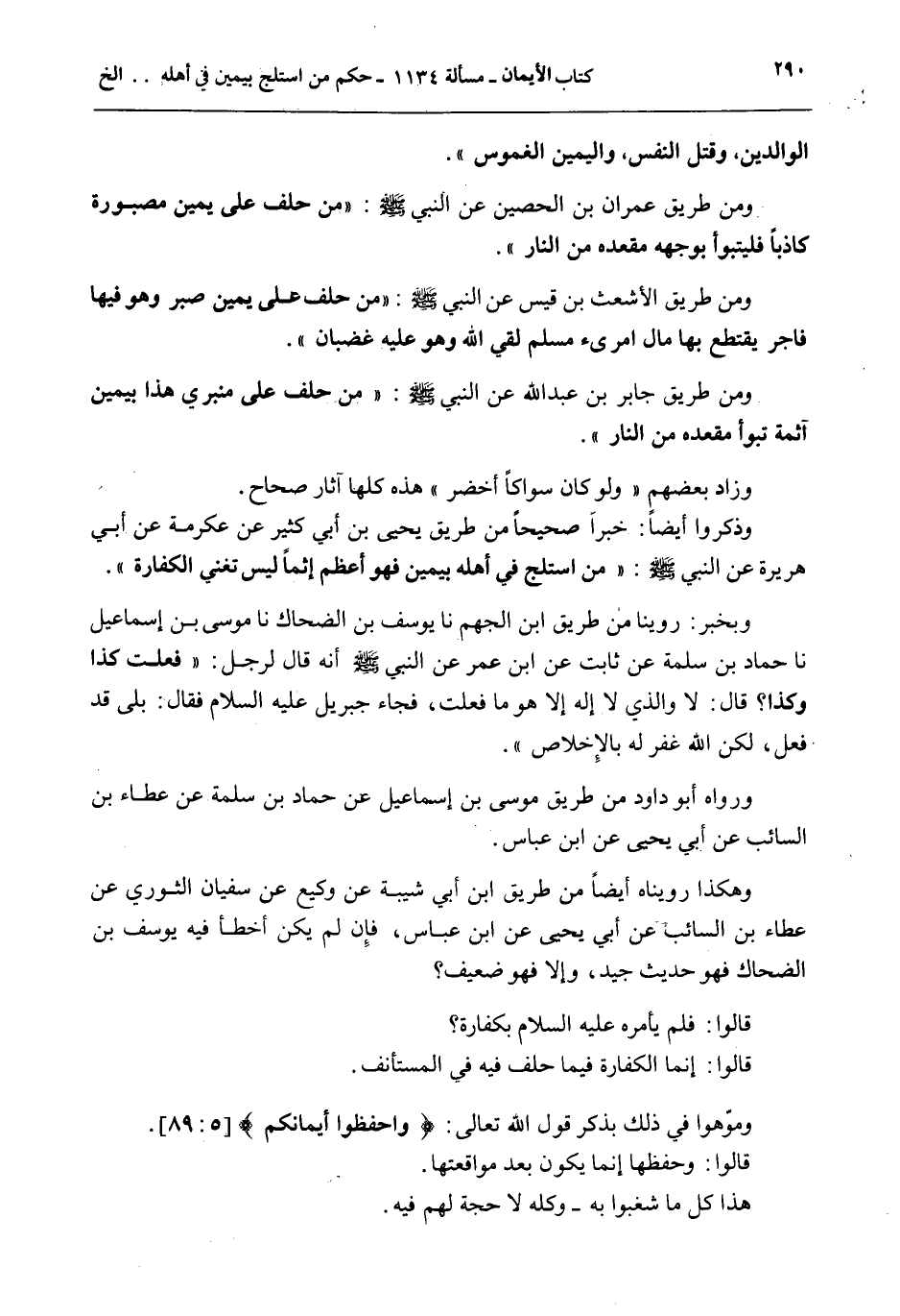 وَذَكَرُوا أَيْضًا: خَبَرًا صَحِيحًا مِنْ طَرِيقِ يَحْيَى بْنِ أَبِي كَثِيرٍ عَنْ عِكْرِمَةَ عَنْ أَبِي هُرَيْرَةَ عَنْ النَّبِيِّ - صَلَّى اللَّهُ عَلَيْهِ وَسَلَّمَ -: «مَنْ اسْتَلَجَّ فِي أَهْلِهِ بِيَمِينٍ فَهُوَ أَعْظَمُ إثْمًا لَيْسَ تُغْنِي الْكَفَّارَةُ» .