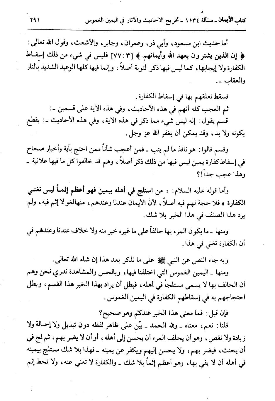 أَمَّا حَدِيثُ ابْنِ مَسْعُودٍ، وَأَبِي ذَرٍّ، وَعِمْرَانَ، وَجَابِرٍ، وَالْأَشْعَثِ، وَقَوْلُ اللَّهِ تَعَالَى {إِنَّ الَّذِينَ يَشْتَرُونَ بِعَهْدِ اللَّهِ وَأَيْمَانِهِمْ} [آل عمران: 77] فَلَيْسَ فِي شَيْءٍ مِنْ ذَلِكَ إسْقَاطُ الْكَفَّارَةِ وَلَا إيجَابُهَا، كَمَا لَيْسَ فِيهَا ذِكْرٌ لِتَوْبَةٍ أَصْلًا، وَإِنَّمَا فِيهَا كُلِّهَا الْوَعِيدُ الشَّدِيدُ بِالنَّارِ وَالْعِقَابِ -.