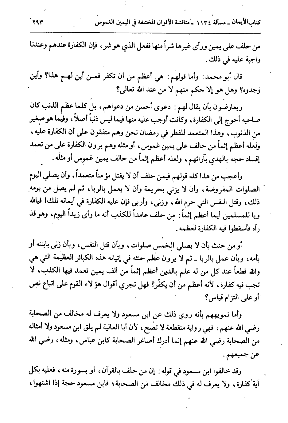 أَوْ مَنْ حَنِثَ بِأَنْ لَا يُصَلِّيَ الْخَمْسَ صَلَوَاتٍ، وَبِأَنْ قَتَلَ النَّفْسَ، وَبِأَنْ زَنَى بِابْنَتِهِ أَوْ بِأُمِّهِ، وَبِأَنْ عَمِلَ بِالرِّبَا - ثُمَّ لَا يَرَوْنَ عِظَمَ حِنْثِهِ فِي إتْيَانِهِ هَذِهِ الْكَبَائِرِ الْعَظِيمَةِ الَّتِي هِيَ وَاَللَّهِ قَطْعًا عِنْدَ كُلِّ مَنْ لَهُ عِلْمٌ بِالدِّينِ أَعْظَمُ إثْمًا مِنْ أَلْفِ يَمِينٍ تَعَمَّدَ فِيهَا الْكَذِبَ، لَا تَجِبُ فِيهِ كَفَّارَةٌ؛ لِأَنَّهُ أَعْظَمُ مِنْ أَنْ يُكَفِّرَ؟ فَهَلْ تَجْرِي أَقْوَالُ هَؤُلَاءِ الْقَوْمِ عَلَى اتِّبَاعِ نَصٍّ أَوْ عَلَى الْتِزَامِ قِيَاسٍ؟ وَأَمَّا تَمْوِيهُهُمْ بِأَنَّهُ رُوِيَ ذَلِكَ عَنْ ابْنِ مَسْعُودٍ وَلَا يُعْرَفُ لَهُ مُخَالِفٌ مِنْ الصَّحَابَةِ - رَضِيَ اللَّهُ عَنْهُمْ -، فَهِيَ رِوَايَةٌ مُنْقَطِعَةٌ لَا تَصِحُّ؛ لِأَنَّ أَبَا الْعَالِيَةِ لَمْ يَلْقَ ابْنَ مَسْعُودٍ وَلَا أَمْثَالَهُ مِنْ الصَّحَابَةِ - رَضِيَ اللَّهُ عَنْهُمْ - إنَّمَا أَدْرَكَ أَصَاغِرَ الصَّحَابَةِ كَابْنِ عَبَّاسٍ، وَمِثْلِهِ، رَضِيَ اللَّهُ عَنْ جَمِيعِهِمْ.