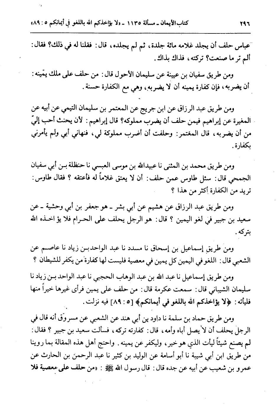 وَمِنْ طَرِيقِ مُحَمَّدِ بْنِ الْمُثَنَّى نا عُبَيْدُ اللَّهِ بْنُ مُوسَى الْعَبْسِيُّ نا حَنْظَلَةُ بْنُ أَبِي سُفْيَانَ الْجُمَحِيُّ قَالَ: سُئِلَ طَاوُسٌ عَمَّنْ حَلَفَ: أَنْ لَا يَعْتِقَ غُلَامًا لَهُ فَأَعْتَقَهُ؟ فَقَالَ طَاوُوسٌ: تُرِيدُ مِنْ الْكَفَّارَةِ أَكْثَرَ مِنْ هَذَا؟ وَمِنْ طَرِيقِ عَبْدِ الرَّزَّاقِ عَنْ هُشَيْمٍ عَنْ أَبِي بِشْرٍ هُوَ جَعْفَرُ بْنُ أَبِي وَحْشِيَّةَ - عَنْ سَعِيدِ بْنِ جُبَيْرٍ فِي لَغْوِ الْيَمِينِ؟ قَالَ: هُوَ الرَّجُلُ يَحْلِفُ عَلَى الْحَرَامِ فَلَا يُؤَاخِذُهُ اللَّهُ بِتَرْكِهِ.
