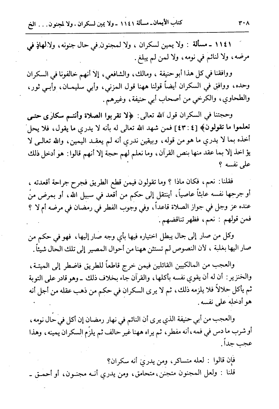 وَحُجَّتُنَا فِي السَّكْرَانِ قَوْلُ اللَّهِ تَعَالَى: {لا تَقْرَبُوا الصَّلاةَ وَأَنْتُمْ سُكَارَى حَتَّى تَعْلَمُوا مَا تَقُولُونَ} [النساء: 43] فَمَنْ شَهِدَ اللَّهُ تَعَالَى لَهُ بِأَنَّهُ لَا يَدْرِي مَا يَقُولُ، فَلَا يَحِلُّ أَخْذُهُ بِمَا لَا يَدْرِي مَا هُوَ مِنْ قَوْلِهِ، وَبِيَقِينٍ نَدْرِي أَنَّهُ لَمْ يَعْقِدْ الْيَمِينَ، وَاَللَّهُ تَعَالَى لَا يُؤَاخِذُ إلَّا بِمَا عَقَّدَ مِنْهَا بِنَصِّ الْقُرْآنِ، وَمَا نَعْلَمُ لَهُمْ حُجَّةً إلَّا أَنَّهُمْ قَالُوا: هُوَ أَدْخَلَ ذَلِكَ عَلَى نَفْسِهِ؟ فَقُلْنَا: نَعَمْ، فَكَانَ مَاذَا؟ وَمَا تَقُولُونَ فِيمَنْ قَطَعَ الطَّرِيقَ فَجُرِحَ جِرَاحَةً أَقْعَدَتْهُ، أَوْ جَرَحَهَا نَفْسَهُ عَابِثًا عَاصِيًا، أَيَنْتَقِلُ إلَى حُكْمِ مَنْ أُقْعِدَ فِي سَبِيلِ اللَّهِ، أَوْ بِمَرَضٍ مِنْ عِنْدِهِ عَزَّ وَجَلَّ فِي جَوَازِ الصَّلَاةِ قَاعِدًا، وَفِي وُجُوبِ الْفِطْرِ فِي رَمَضَانَ فِي مَرَضِهِ أَمْ لَا؟ فَمِنْ قَوْلِهِمْ: نَعَمْ، فَظَهَرَ تَنَاقُضُهُمْ.