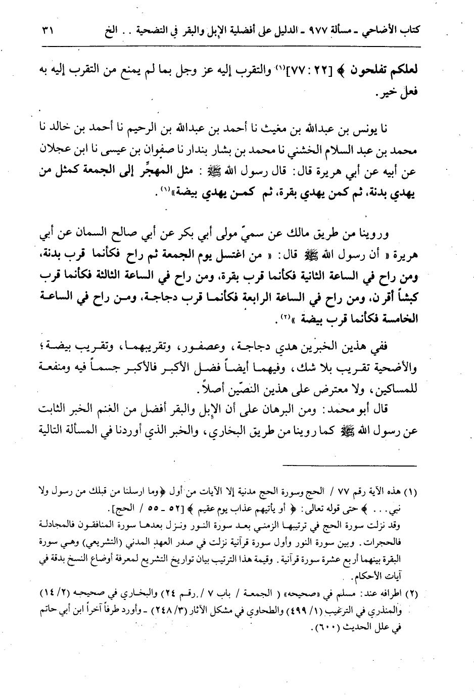 قَالَ أَبُو مُحَمَّدٍ: وَمِنْ الْبُرْهَانِ عَلَى أَنَّ الْإِبِلَ وَالْبَقَرَ أَفْضَلُ مِنْ الْغَنَمِ الْخَبَرُ الثَّابِتُ عَنْ رَسُولِ اللَّهِ - صَلَّى اللَّهُ عَلَيْهِ وَسَلَّمَ - كَمَا رُوِّينَا مِنْ طَرِيقِ الْبُخَارِيِّ، وَالْخَبَرُ الَّذِي أَوْرَدْنَا فِي الْمَسْأَلَةِ التَّالِيَةِ