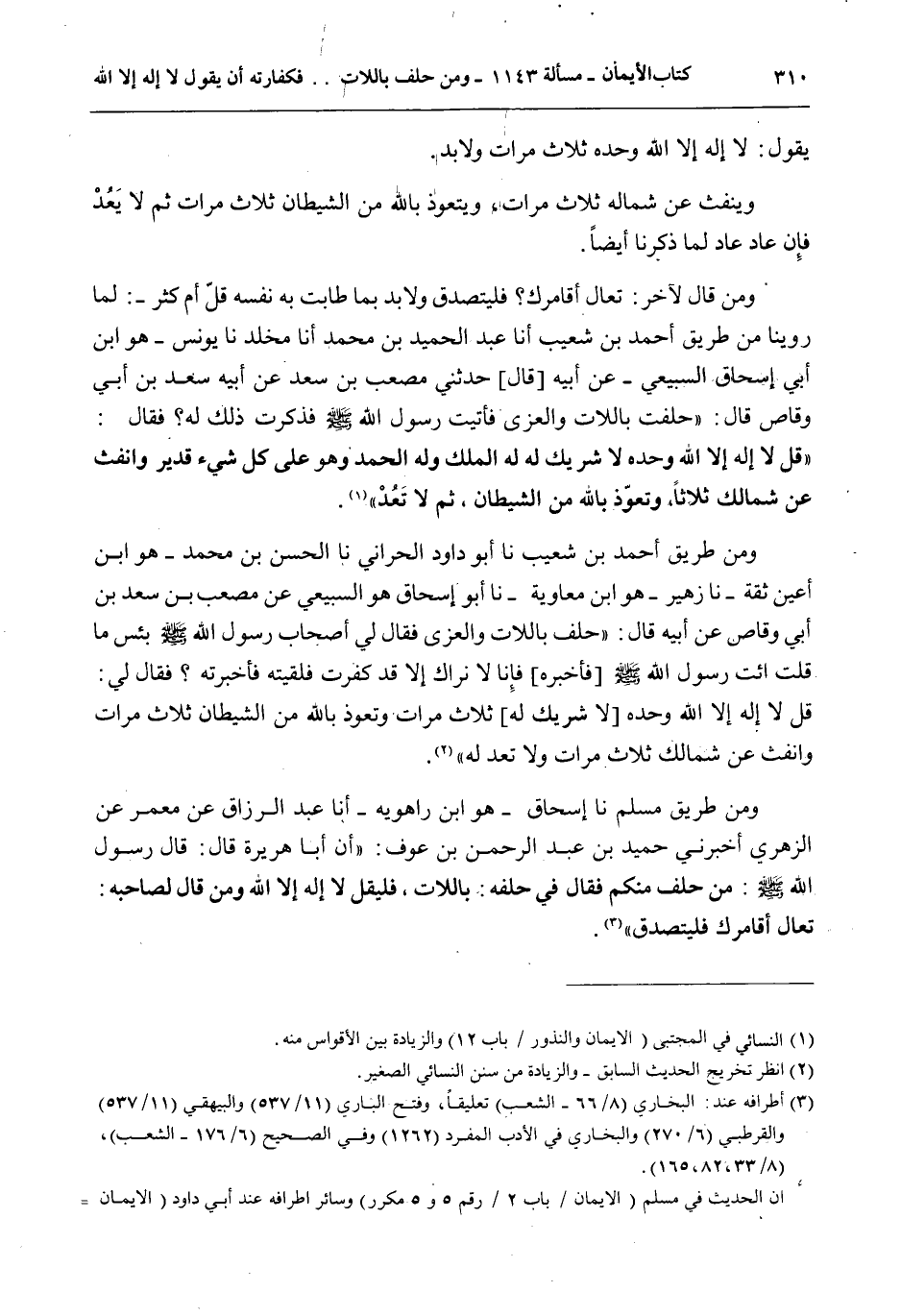 وَمِنْ طَرِيقِ أَحْمَدَ بْنِ شُعَيْبٍ نا أَبُو دَاوُد الْحَرَّانِيُّ نا الْحَسَنُ بْنُ مُحَمَّدٍ هُوَ ابْنُ أَعْيَنَ ثِقَةٌ - نا زُهَيْرٌ هُوَ ابْنُ مُعَاوِيَةَ - نا أَبُو إِسْحَاقَ هُوَ السَّبِيعِيِّ عَنْ «مُصْعَبِ بْنِ سَعْدِ بْنِ أَبِي وَقَّاصٍ عَنْ أَبِيهِ قَالَ: حَلَفْتُ بِاللَّاتِ وَالْعُزَّى فَقَالَ لِي أَصْحَابُ رَسُولِ اللَّهِ - صَلَّى اللَّهُ عَلَيْهِ وَسَلَّمَ -: بِئْسَ مَا قُلْتَ ائْتِ رَسُولَ اللَّهِ - صَلَّى اللَّهُ عَلَيْهِ وَسَلَّمَ - فَأَخْبِرْهُ فَإِنَّا لَا نَرَاكَ إلَّا قَدْ كَفَرْتَ فَلَقِيتُهُ فَأَخْبَرْتُهُ؟ فَقَالَ لِي: قُلْ لَا إلَهَ إلَّا اللَّهُ وَحْدَهُ لَا شَرِيكَ لَهُ ثَلَاثَ مَرَّاتٍ وَتَعَوَّذْ بِاَللَّهِ مِنْ الشَّيْطَانِ ثَلَاثَ مَرَّاتٍ وَانْفُثْ عَنْ شِمَالِكَ ثَلَاثَ مَرَّاتٍ وَلَا تَعُدْ لَهُ» .