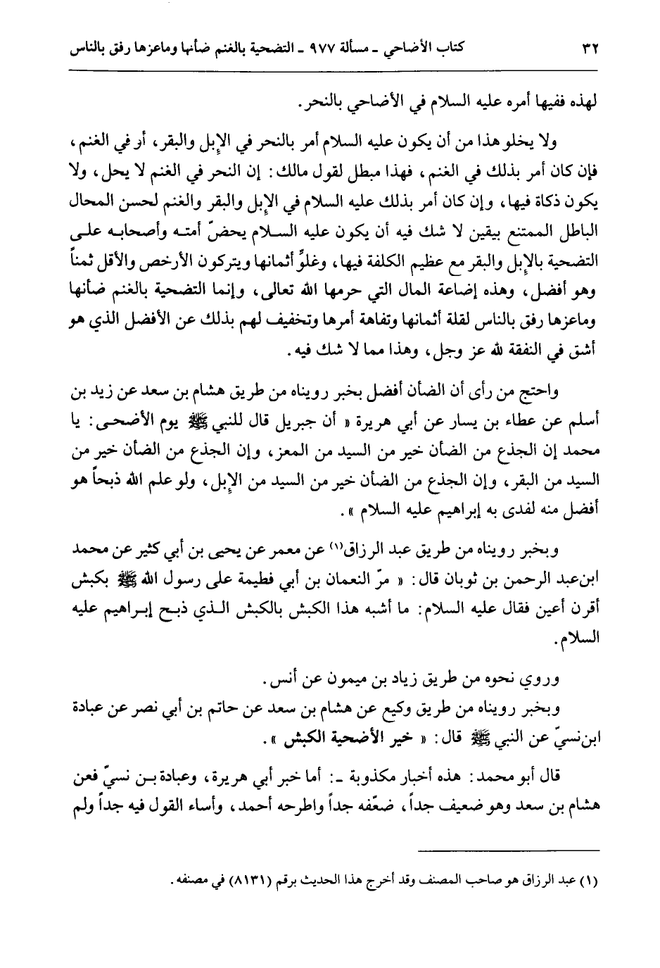 وَبِخَبَرٍ رُوِّينَاهُ مِنْ طَرِيقِ عَبْدِ الرَّزَّاقِ مَعْمَرٍ عَنْ يَحْيَى بْنِ أَبِي كَثِيرٍ عَنْ مُحَمَّدِ بْنِ عَبْدِ الرَّحْمَنِ بْنِ ثَوْبَانَ قَالَ: «مَرَّ النُّعْمَانُ بْنُ أَبِي فَطِيمَةَ عَلَى رَسُولِ اللَّهِ - صَلَّى اللَّهُ عَلَيْهِ وَسَلَّمَ - بِكَبْشٍ أَقَرْنَ أَعْيَنَ فَقَالَ - عَلَيْهِ السَّلَامُ -: مَا أَشْبَهَ هَذَا الْكَبْشَ بِالْكَبْشِ الَّذِي ذَبَحَ إبْرَاهِيمُ - عَلَيْهِ السَّلَامُ -» .