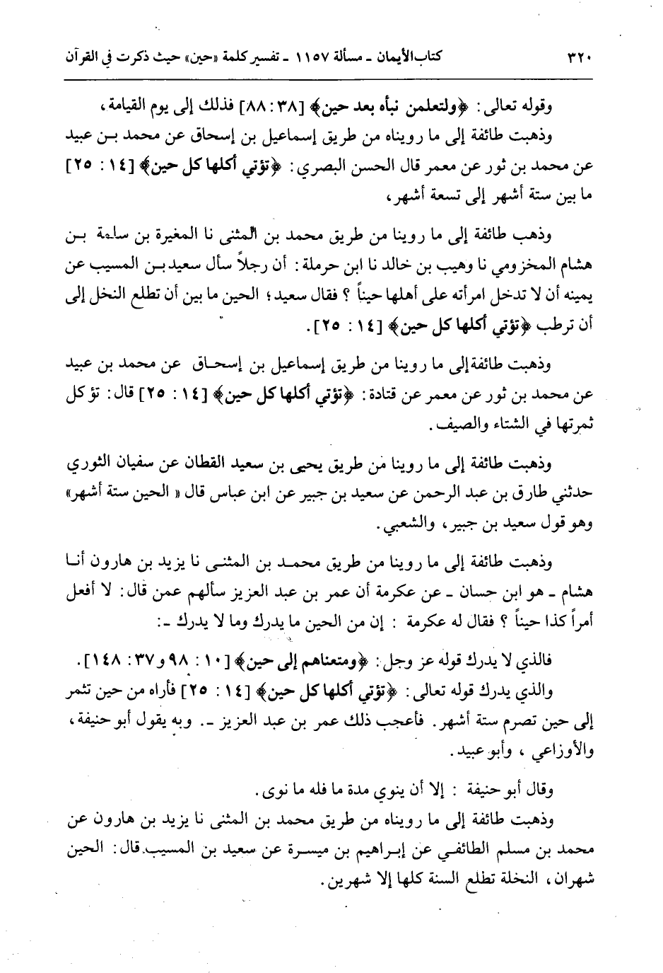 وَذَهَبَتْ طَائِفَةٌ إلَى مَا رُوِّينَاهُ مِنْ طَرِيقِ إسْمَاعِيلَ بْنِ إِسْحَاقَ عَنْ مُحَمَّدِ بْنِ عُبَيْدٍ عَنْ مُحَمَّدِ بْنِ ثَوْرٍ عَنْ مَعْمَرٍ قَالَ الْحَسَنُ الْبَصْرِيُّ: {تُؤْتِي أُكُلَهَا كُلَّ حِينٍ} [إبراهيم: 25] مَا بَيْنَ سِتَّةِ أَشْهُرٍ إلَى تِسْعَةِ أَشْهُرٍ، وَذَهَبَ طَائِفَةٌ إلَى مَا رُوِّينَا مِنْ طَرِيقِ مُحَمَّدِ بْنِ الْمُثَنَّى نا الْمُغِيرَةُ بْنُ سَلَمَةَ بْنِ هِشَامٍ الْمَخْزُومِيُّ نا وُهَيْبُ بْنُ خَالِدٍ نا ابْنُ حَرْمَلَةَ: أَنَّ رَجُلًا سَأَلَ سَعِيدَ بْنَ الْمُسَيِّبِ عَنْ يَمِينِهِ أَنْ لَا تَدْخُلَ امْرَأَتُهُ عَلَى أَهْلِهَا حِينًا؟ فَقَالَ سَعِيدٌ؛ الْحِينُ مَا بَيْنَ أَنْ تَطْلُعَ النَّخْلُ إلَى أَنْ تُرَطِّبَ {تُؤْتِي أُكُلَهَا كُلَّ حِينٍ} [إبراهيم: 25]
