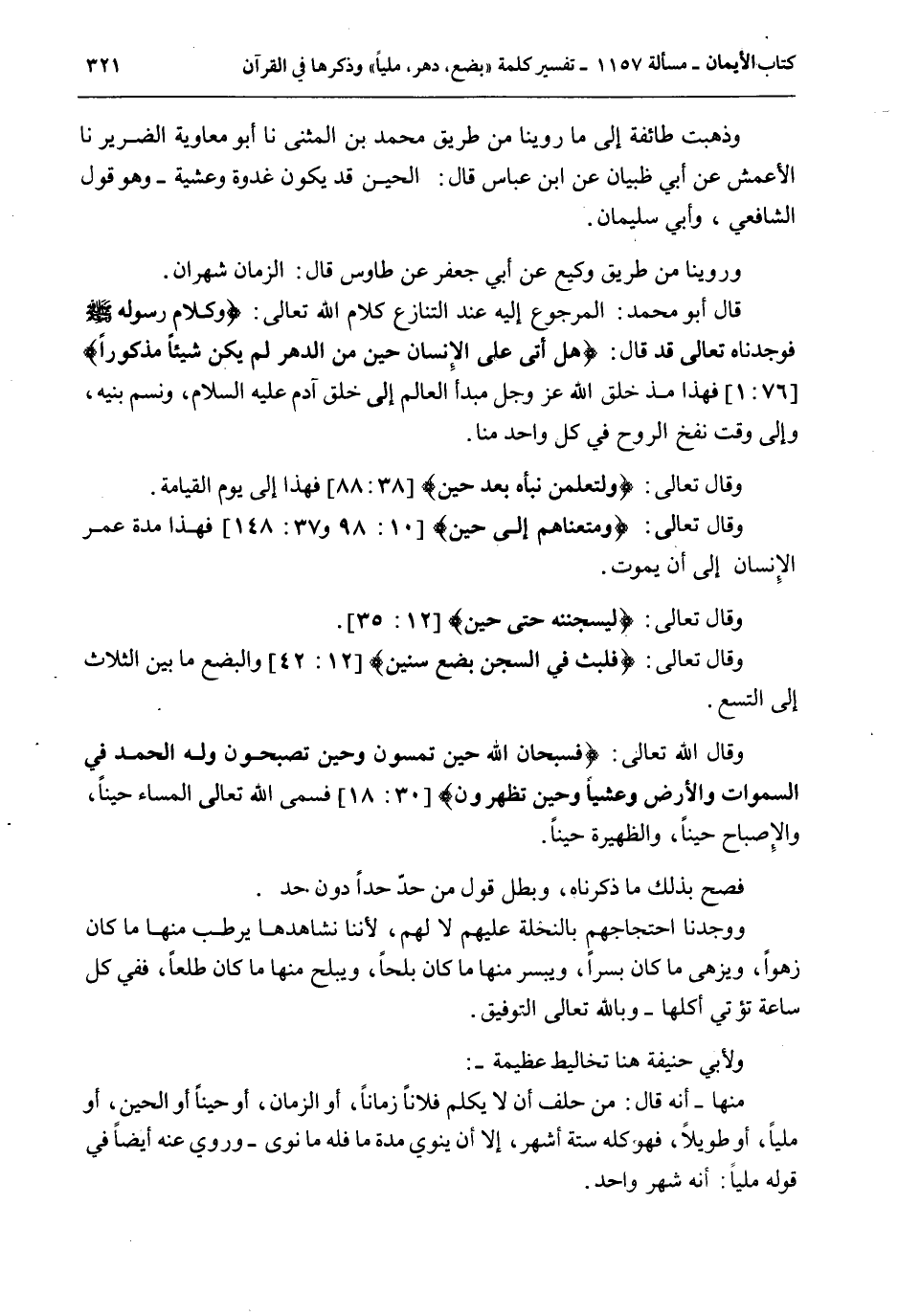 وَذَهَبَتْ طَائِفَةٌ إلَى مَا رُوِّينَا مِنْ طَرِيقِ مُحَمَّدِ بْنِ الْمُثَنَّى نا أَبُو مُعَاوِيَةَ الضَّرِيرُ نا الْأَعْمَشُ عَنْ أَبِي ظَبْيَانَ عَنْ ابْنِ عَبَّاسٍ قَالَ: الْحِينُ قَدْ يَكُونُ غُدْوَةً وَعَشِيَّةً - وَهُوَ قَوْلُ الشَّافِعِيِّ، وَأَبِي سُلَيْمَانَ.