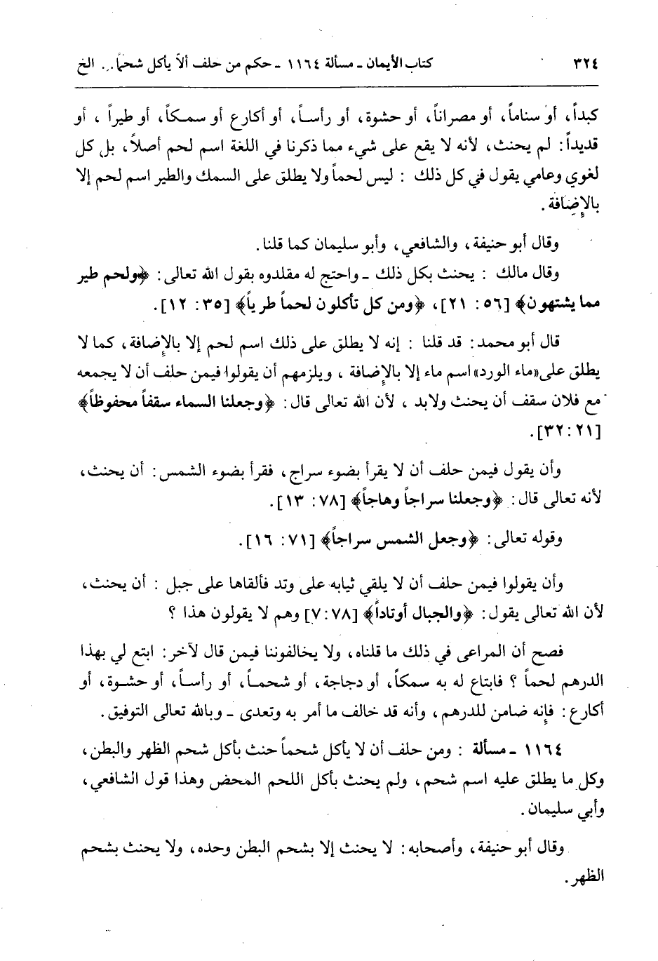 وَأَنْ يَقُولَ فِيمَنْ حَلَفَ أَنْ لَا يَقْرَأَ بِضَوْءِ سِرَاجٍ، فَقَرَأَ بِضَوْءِ الشَّمْسِ: أَنْ يَحْنَثَ، لِأَنَّهُ تَعَالَى قَالَ: {وَجَعَلْنَا سِرَاجًا وَهَّاجًا} [النبأ: 13] .