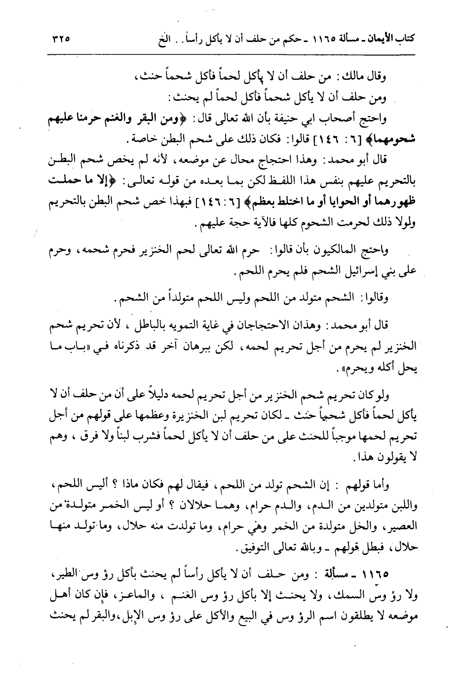 وَقَالَ مَالِكٌ: مَنْ حَلَفَ أَنْ لَا يَأْكُلَ لَحْمًا فَأَكَلَ شَحْمًا حَنِثَ، وَمَنْ حَلَفَ أَنْ لَا يَأْكُلَ شَحْمًا فَأَكَلَ لَحْمًا يَحْنَثُ: وَاحْتَجَّ أَصْحَابُ أَبِي حَنِيفَةَ بِأَنَّ اللَّهَ تَعَالَى قَالَ: {وَمِنَ الْبَقَرِ وَالْغَنَمِ حَرَّمْنَا عَلَيْهِمْ شُحُومَهُمَا} [الأنعام: 146] قَالُوا: فَكَانَ ذَلِكَ عَلَى شَحْمِ الْبَطْنِ خَاصَّةً.