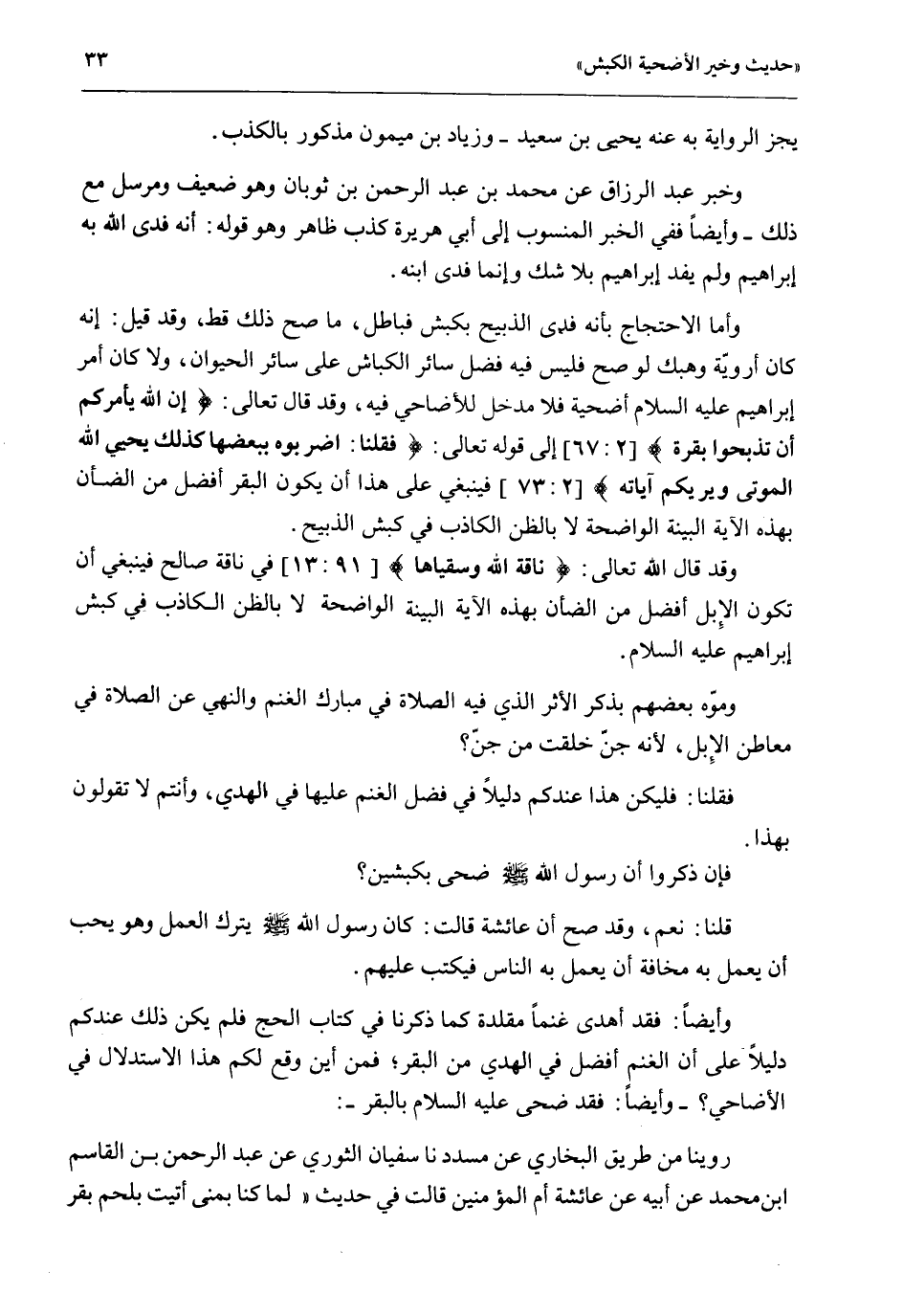 وَأَمَّا الِاحْتِجَاجُ بِأَنَّهُ فَدَى الذَّبِيحَ بِكَبْشٍ فَبَاطِلٌ، مَا صَحَّ ذَلِكَ قَطُّ، وَقَدْ قِيلَ: إنَّهُ كَانَ أُرْوِيَّةً، وَهَبْكَ لَوْ صَحَّ فَلَيْسَ فِيهِ فَضْلُ سَائِرِ الْكِبَاشِ عَلَى سَائِرِ الْحَيَوَانِ، وَلَا كَانَ أَمْرُ إبْرَاهِيمَ - عَلَيْهِ السَّلَامُ - أُضْحِيَّةً فَلَا مَدْخَلَ لِلْأَضَاحِيِّ فِيهِ، وَقَدْ قَالَ تَعَالَى: {إِنَّ اللَّهَ يَأْمُرُكُمْ أَنْ تَذْبَحُوا بَقَرَةً} [البقرة: 67] إلَى قَوْله تَعَالَى: {فَقُلْنَا اضْرِبُوهُ بِبَعْضِهَا كَذَلِكَ يُحْيِي اللَّهُ الْمَوْتَى وَيُرِيكُمْ آيَاتِهِ} [البقرة: 73] فَيَنْبَغِي عَلَى هَذَا أَنْ يَكُونَ الْبَقَرُ أَفْضَلَ مِنْ الضَّأْنِ بِهَذِهِ الْآيَةِ الْبَيِّنَةِ الْوَاضِحَةِ لَا بِالظَّنِّ الْكَاذِبِ فِي كَبْشِ الذَّبِيحِ.