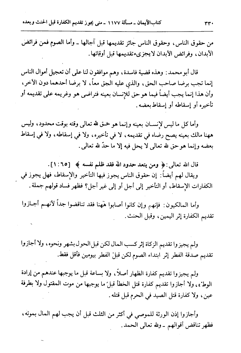وَأَمَّا الْمَالِكِيُّونَ: فَإِنَّهُمْ وَإِنْ كَانُوا أَصَابُوا هَهُنَا فَقَدْ تَنَاقَضُوا جِدًّا لِأَنَّهُمْ أَجَازُوا تَقْدِيمَ الْكَفَّارَةِ إثْرَ الْيَمِينِ، وَقَبْلَ الْحِنْثِ.