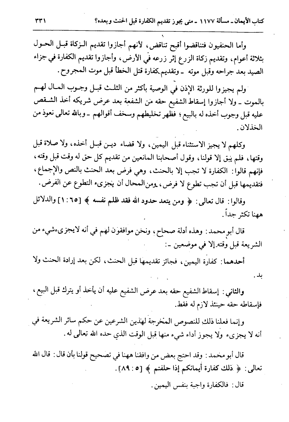 قَالَ أَبُو مُحَمَّدٍ: وَهَذِهِ أَدِلَّةٌ صِحَاحٌ؛ وَنَحْنُ مُوَافِقُونَ لَهُمْ فِي أَنَّهُ لَا يُجْزِئُ شَيْءٌ مِنْ الشَّرِيعَةِ قَبْلَ وَقْتِهِ إلَّا فِي مَوْضِعَيْنِ -: أَحَدُهُمَا: كَفَّارَةُ الْيَمِينِ، فَجَائِزٌ تَقْدِيمُهَا قَبْلَ الْحِنْثِ، لَكِنْ بَعْدَ إرَادَةِ الْحِنْثِ وَلَا بُدَّ. وَالثَّانِي: