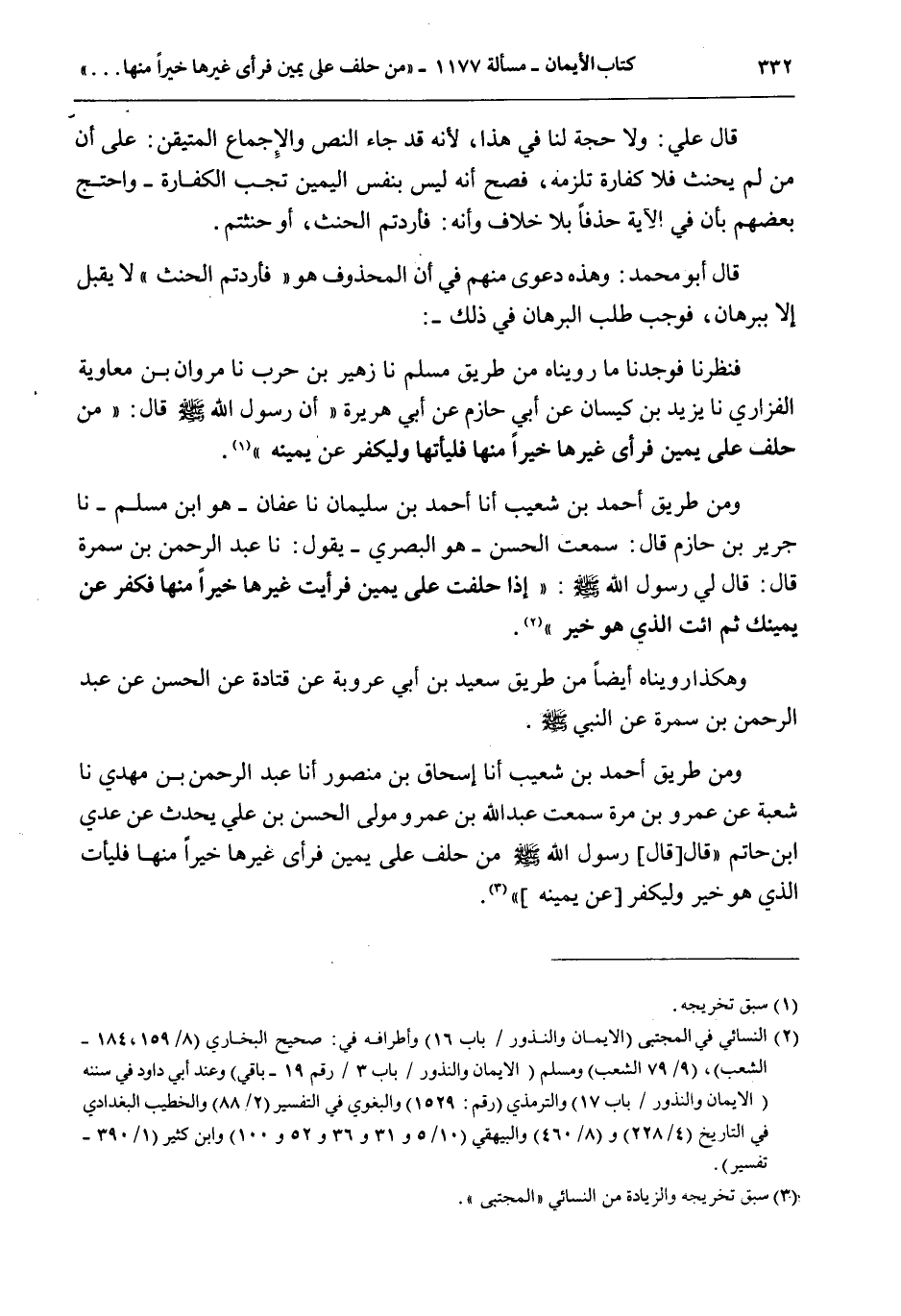 قَالَ أَبُو مُحَمَّدٍ: وَهَذِهِ دَعْوَى مِنْهُمْ فِي أَنَّ الْمَحْذُوفَ هُوَ " فَأَرَدْتُمْ الْحِنْثَ " لَا يُقْبَلُ إلَّا بِبُرْهَانٍ، فَوَجَبَ طَلَبُ الْبُرْهَانِ فِي ذَلِكَ -: فَنَظَرْنَا فَوَجَدْنَا مَا رُوِّينَاهُ مِنْ طَرِيقِ مُسْلِمٍ نا زُهَيْرُ بْنُ حَرْبٍ نا مَرْوَانُ بْنُ مُعَاوِيَةَ الْفَزَارِيّ نا يَزِيدُ بْنُ كَيْسَانَ عَنْ أَبِي حَازِمٍ عَنْ أَبِي هُرَيْرَةَ أَنَّ رَسُولَ اللَّهِ - صَلَّى اللَّهُ عَلَيْهِ وَسَلَّمَ - قَالَ: «مَنْ حَلَفَ عَلَى يَمِينٍ فَرَأَى غَيْرَهَا خَيْرًا مِنْهَا فَلْيَأْتِهَا وَلْيُكَفِّرْ عَنْ يَمِينِهِ» .