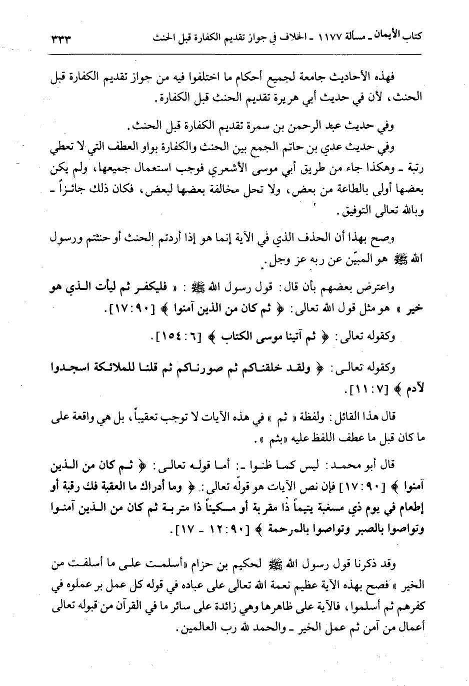 وَفِي حَدِيثِ عَدِيِّ بْنِ حَاتِمٍ الْجَمْعَ بَيْنَ الْحِنْثِ وَالْكَفَّارَةِ بِوَاوِ الْعَطْفِ الَّتِي لَا تُعْطِي رُتْبَةً - هَكَذَا جَاءَ مِنْ طَرِيقِ أَبِي مُوسَى الْأَشْعَرِيِّ فَوَجَبَ اسْتِعْمَالُ جَمِيعِهَا، وَلَمْ يَكُنْ بَعْضُهَا أَوْلَى بِالطَّاعَةِ مِنْ بَعْضٍ، وَلَا تَحِلُّ مُخَالَفَةُ بَعْضِهَا لِبَعْضٍ، فَكَانَ ذَلِكَ جَائِزًا - وَبِاَللَّهِ تَعَالَى التَّوْفِيقُ.