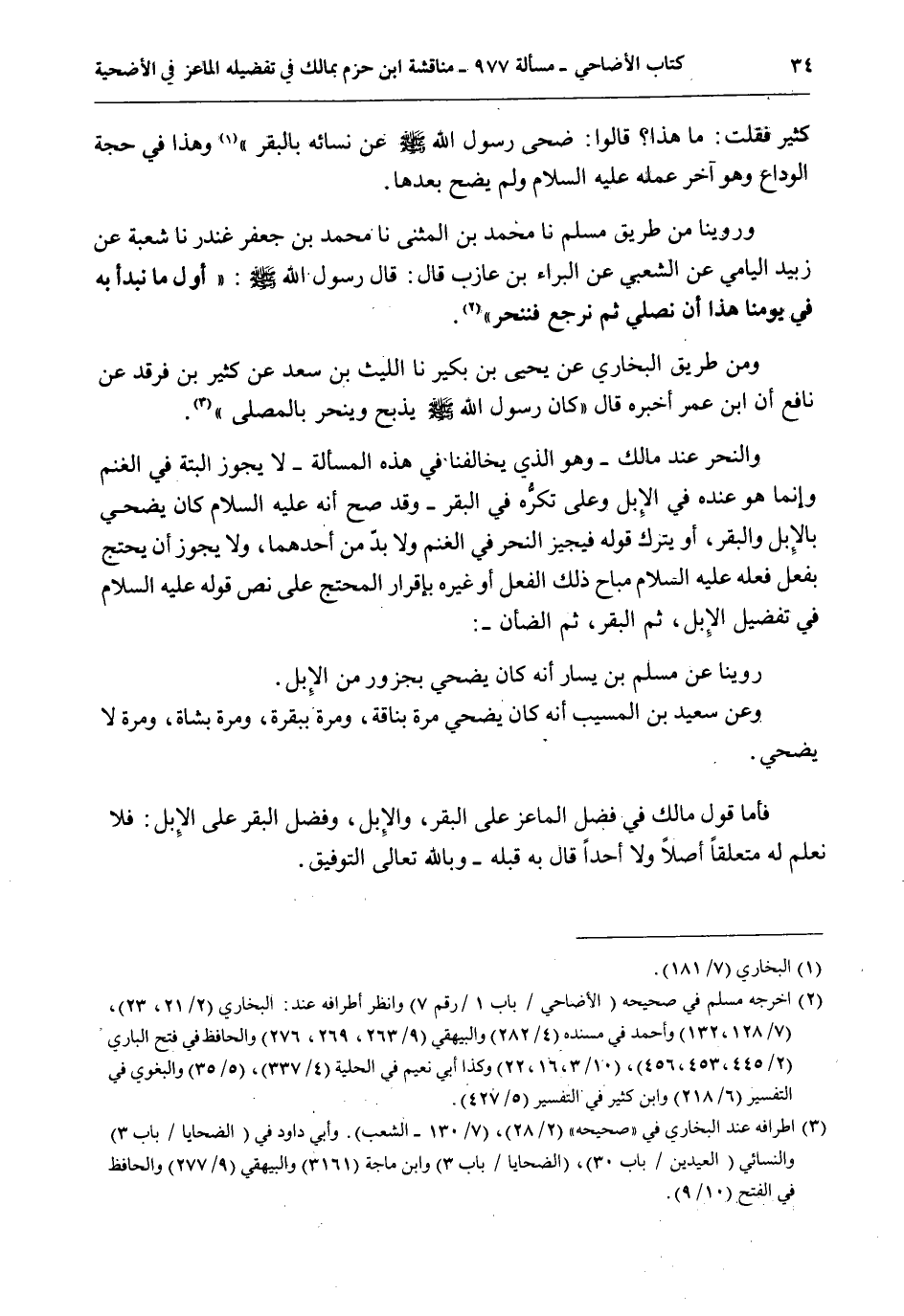 وَالنَّحْرُ عِنْدَ مَالِكٍ - وَهُوَ الَّذِي يُخَالِفُنَا فِي هَذِهِ الْمَسْأَلَةِ - لَا يَجُوزُ أَلْبَتَّةَ فِي الْغَنَمِ وَإِنَّمَا هُوَ عِنْدَهُ فِي الْإِبِلِ وَعَلَى تَكَرُّهٍ فِي الْبَقَرِ - وَقَدْ صَحَّ أَنَّهُ - عَلَيْهِ السَّلَامُ - كَانَ يُضَحِّي بِالْإِبِلِ وَالْبَقَرِ، أَوْ يَتْرُكُ قَوْلَهُ فَيُجِيزُ النَّحْرَ فِي الْغَنَمِ وَلَا بُدَّ مِنْ أَحَدِهِمَا، وَلَا يَجُوزُ أَنْ يُحْتَجَّ بِفِعْلٍ فَعَلَهُ - عَلَيْهِ السَّلَامُ - مُبَاحُ ذَلِكَ الْفِعْلِ أَوْ غَيْرُهُ بِإِقْرَارِ الْمُحْتَجِّ عَلَى نَصِّ قَوْلِهِ - عَلَيْهِ السَّلَامُ - فِي تَفْضِيلِ الْإِبِلِ، ثُمَّ الْبَقَرِ، ثُمَّ الضَّأْنِ.
