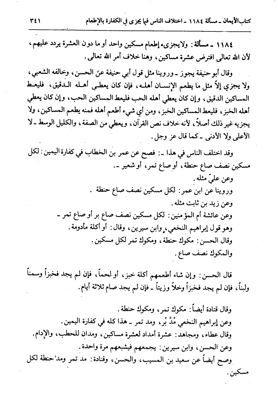وَقَالَ أَبُو حَنِيفَةَ يَجُوزُ - وَرُوِّينَا مِثْلَ قَوْلِ أَبِي حَنِيفَةَ عَنْ الْحَسَنِ، وَخَالَفَهُ الشَّعْبِيُّ، وَلَا يُجْزِئُ إلَّا مِثْلُ مَا يُطْعِمُ الْإِنْسَانُ أَهْلَهُ، فَإِنْ كَانَ يُعْطِي أَهْلَهُ الدَّقِيقَ، فَلْيُعْطِ الْمَسَاكِينَ الدَّقِيقَ، وَإِنْ كَانَ يُعْطِي أَهْلَهُ الْحَبَّ فَلْيُعْطِ الْمَسَاكِينَ الْحَبَّ، وَإِنْ كَانَ يُعْطِي أَهْلَهُ الْخُبْزَ، فَلْيُعْطِ الْمَسَاكِينَ الْخُبْزَ، وَمِنْ أَيِّ شَيْءٍ أَطْعَمَ أَهْلَهُ فَمِنْهُ يُطْعِمُ الْمَسَاكِينَ، وَلَا يُجْزِئُهُ غَيْرُ ذَلِكَ أَصْلًا، لِأَنَّهُ خِلَافُ نَصِّ الْقُرْآنِ وَيُعْطِي مِنْ الصِّفَةِ، وَالْمَكِيلِ الْوَسَطِ - لَا الْأَعْلَى وَلَا الْأَدْنَى - كَمَا قَالَ عَزَّ وَجَلَّ. وَقَدْ اخْتَلَفَ النَّاسُ فِي هَذَا -: فَصَحَّ عَنْ عُمَرَ بْنِ الْخَطَّابِ فِي كَفَّارَةِ الْيَمِينِ: لِكُلِّ مِسْكِينٍ نِصْفُ صَاعِ حِنْطَةٍ، أَوْ صَاعُ تَمْرٍ، أَوْ شَعِيرٍ -. وَعَنْ عَلِيٍّ مِثْلُهُ.