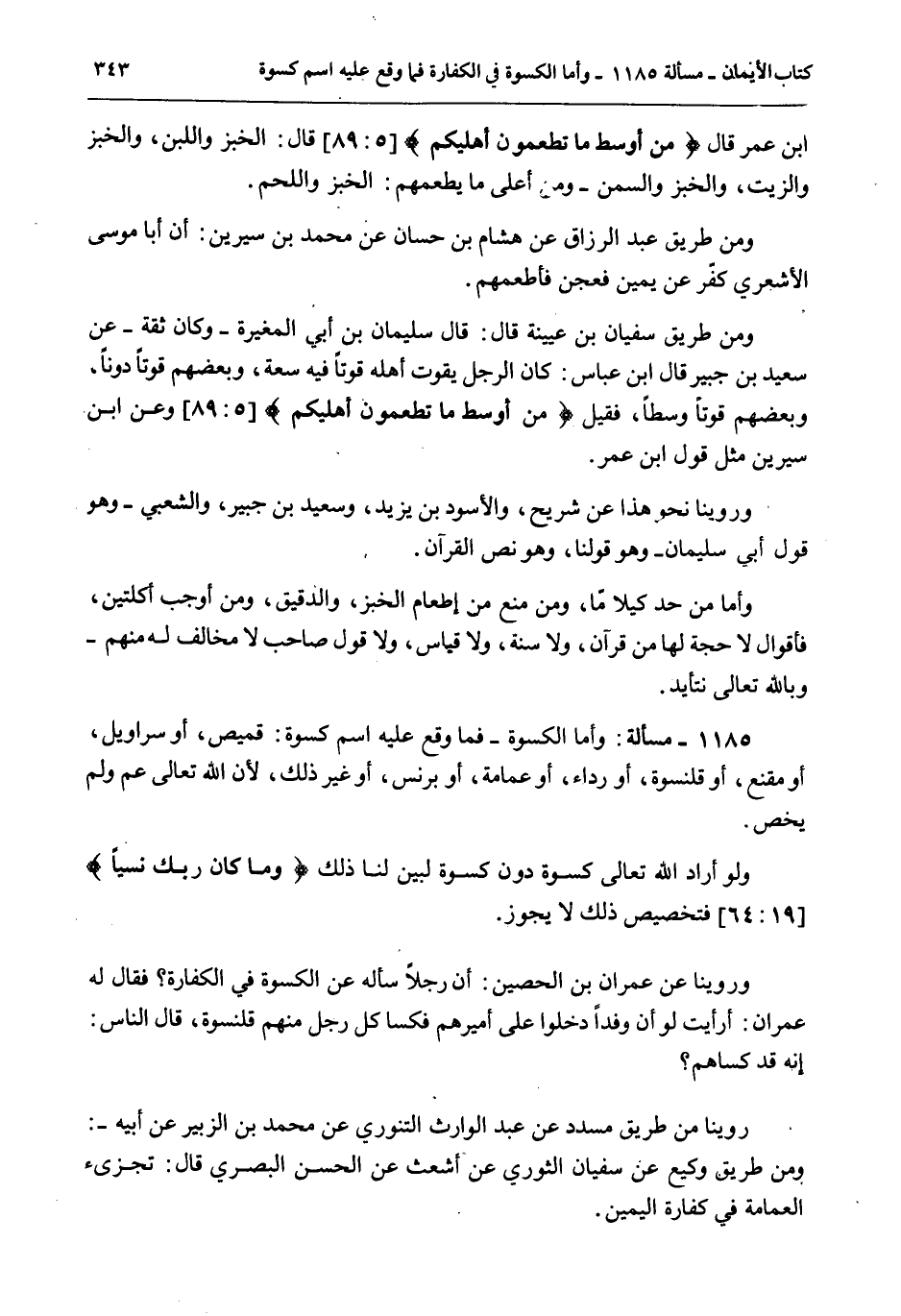 وَرُوِّينَا عَنْ عِمْرَانَ بْنِ الْحُصَيْنِ: أَنَّ رَجُلًا سَأَلَهُ عَنْ الْكِسْوَةِ فِي الْكَفَّارَةِ؟ فَقَالَ لَهُ عِمْرَانُ: أَرَأَيْت لَوْ أَنَّ وَفْدًا دَخَلُوا عَلَى أَمِيرِهِمْ فَكَسَا كُلَّ رَجُلٍ مِنْهُمْ قَلَنْسُوَةً، قَالَ النَّاسُ: إنَّهُ قَدْ كَسَاهُمْ؟ رُوِّينَا مِنْ طَرِيقِ مُسَدَّدٍ عَنْ عَبْدِ الْوَارِثِ التَّنُّورِيِّ عَنْ مُحَمَّدِ بْنِ الزُّبَيْرِ عَنْ أَبِيهِ -: وَمِنْ طَرِيقِ وَكِيعٍ عَنْ سُفْيَانَ الثَّوْرِيِّ عَنْ أَشْعَثَ عَنْ الْحَسَنِ الْبَصْرِيِّ قَالَ: تُجْزِئُ الْعِمَامَةُ فِي كَفَّارَةِ الْيَمِينِ.