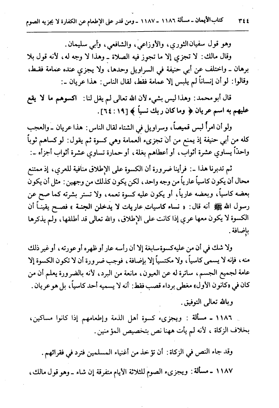 وَلَوْ أَنَّ امْرَأً لَبِسَ قَمِيصًا، وَسَرَاوِيلَ فِي الشِّتَاءِ لَقَالَ النَّاسُ: هَذَا عُرْيَانُ - وَالْعَجَبُ كُلُّهُ مِنْ أَبِي حَنِيفَةَ إذْ يَمْنَعُ مِنْ أَنْ تُجْزِئُ الْعِمَامَةُ وَهِيَ كِسْوَةٌ ثُمَّ يَقُولُ: لَوْ كَسَاهُمْ ثَوْبًا وَاحِدًا يُسَاوِي عَشْرَةَ أَثْوَابٍ، أَوْ أَعْطَاهُمْ بَغْلَةً، أَوْ حِمَارَةً تُسَاوِي عَشْرَةَ أَثْوَابٍ أَجْزَأَهُ -: ثُمَّ تَدَبَّرْنَا هَذَا -: فَرَأَيْنَا ضَرُورَةَ أَنَّ الْكِسْوَةَ عَلَى الْإِطْلَاقِ مُنَافِيَةٌ لِلْعُرْيِ، إذْ مُمْتَنَعٌ مُحَالٌ أَنْ يَكُونَ كَاسِيًا عَارِيًّا مِنْ وَجْهٍ وَاحِدٍ، لَكِنْ يَكُونُ كَذَلِكَ مِنْ وَجْهَيْنِ: مِثْلُ أَنْ يَكُونَ بَعْضُهُ كَاسِيًا، وَبَعْضُهُ عَارِيًّا أَوْ يَكُونُ عَلَيْهِ كِسْوَةٌ تَعُمُّهُ، وَلَا تَسْتُرُ بَشَرَتَهُ كَمَا صَحَّ عَنْ رَسُولِ اللَّهِ - صَلَّى اللَّهُ عَلَيْهِ وَسَلَّمَ - أَنَّهُ قَالَ: «نِسَاءٌ كَاسِيَاتٌ عَارِيَّاتٌ لَا يَدْخُلْنَ الْجَنَّةَ» فَصَحَّ يَقِينًا أَنَّ الْكِسْوَةَ لَا يَكُونُ مَعَهَا عُرْيٌ إذَا كَانَتْ عَلَى الْإِطْلَاقِ، وَاَللَّهُ تَعَالَى قَدْ أَطْلَقَهَا، وَلَمْ يَذْكُرْهَا بِإِضَافَةٍ.