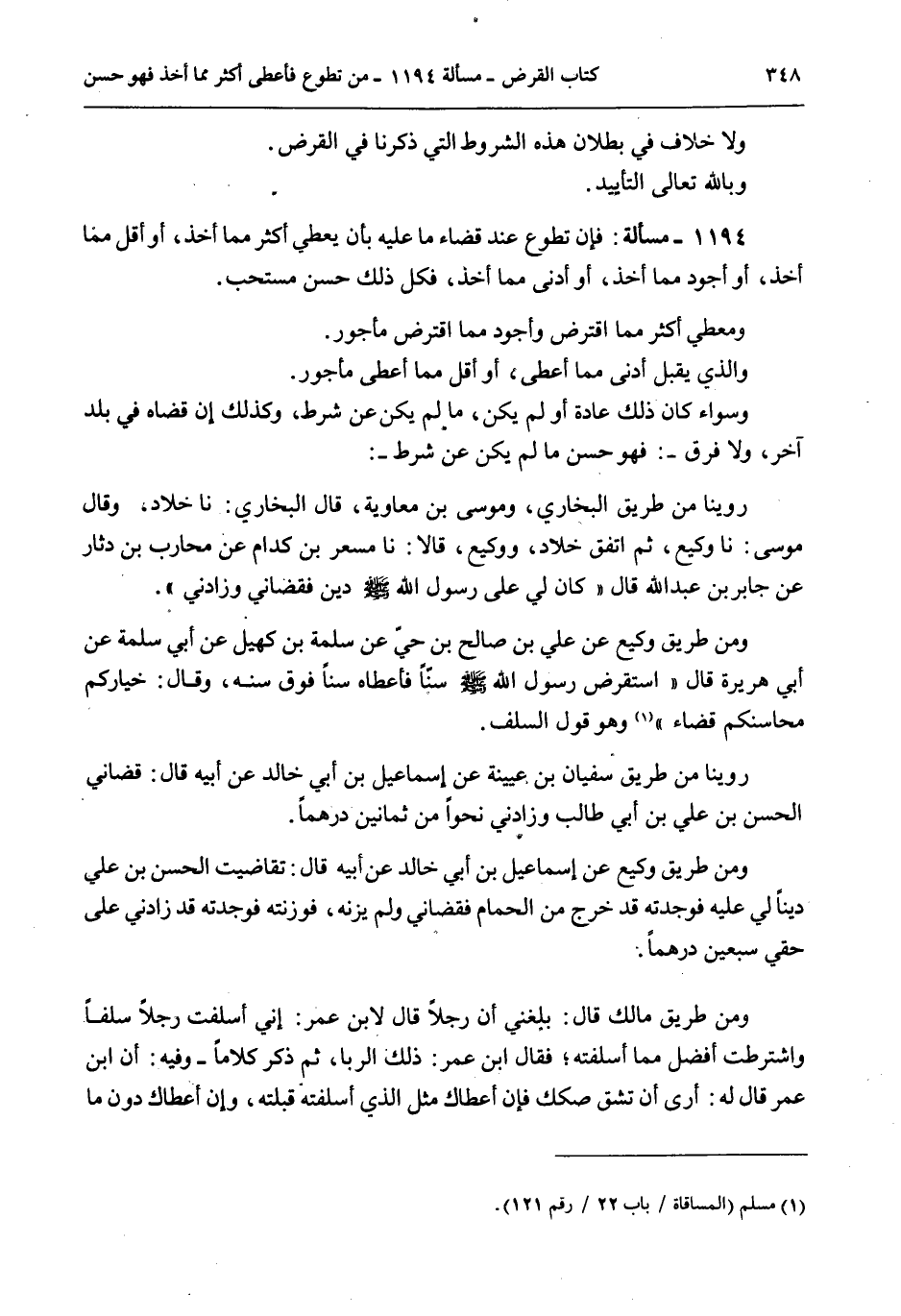 وَسَوَاءٌ كَانَ ذَلِكَ عَادَةً أَوْ لَمْ يَكُنْ، مَا لَمْ يَكُنْ عَنْ شَرْطٍ، وَكَذَلِكَ إنْ قَضَاهُ فِي بَلَدٍ آخَرَ، وَلَا فَرْقَ -: فَهُوَ حَسَنٌ مَا لَمْ يَكُنْ عَنْ شَرْطٍ -: رُوِّينَا مِنْ طَرِيقِ الْبُخَارِيِّ، وَمُوسَى بْنِ مُعَاوِيَةَ، قَالَ الْبُخَارِيُّ: نا خَلَّادٌ، وَقَالَ مُوسَى: نا وَكِيعٌ، ثُمَّ اتَّفَقَ خَلَّادٌ وَوَكِيعٌ، قَالَا: نا مِسْعَرُ بْنُ كِدَامٍ عَنْ مُحَارِبِ بْنِ دِثَارٍ عَنْ جَابِرِ بْنِ عَبْدِ اللَّهِ قَالَ «كَانَ لِي عَلَى رَسُولِ اللَّهِ - صَلَّى اللَّهُ عَلَيْهِ وَسَلَّمَ - دَيْنٌ فَقَضَانِي وَزَادَنِي»
