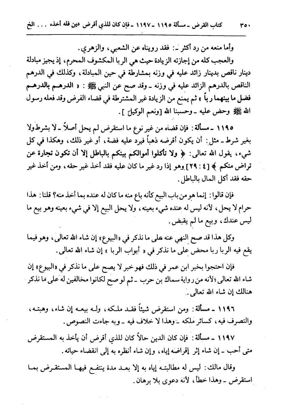 وَأَمَّا مَنْعُهُ مِنْ رَدِّ أَكْثَرَ -: فَقَدْ رُوِّينَاهُ عَنْ الشَّعْبِيِّ، وَالزُّهْرِيِّ. وَالْعَجَبُ كُلُّهُ مِنْ إجَازَتِهِ الزِّيَادَةَ حَيْثُ هِيَ الرِّبَا الْمَكْشُوفُ الْمُحَرَّمُ، إذْ يُجِيزُ مُبَادَلَةَ دِينَارٍ نَاقِصٍ بِدِينَارِ زَائِدٍ عَلَيْهِ فِي وَزْنِهِ بِمُشَارَطَةٍ فِي حِينِ الْمُبَادَلَةِ، وَكَذَلِكَ فِي الدِّرْهَمِ النَّاقِصِ بِالدِّرْهَمِ الزَّائِدِ عَلَيْهِ فِي وَزْنِهِ - وَقَدْ صَحَّ عَنْ النَّبِيِّ - صَلَّى اللَّهُ عَلَيْهِ وَسَلَّمَ -: «الدِّرْهَمُ بِالدِّرْهَمِ فَضْلُ مَا بَيْنَهُمَا رِبًا» ثُمَّ يَمْنَعُ مِنْ الزِّيَادَةِ غَيْرِ الْمُشْتَرَطَةِ فِي قَضَاءِ الْقَرْضِ وَقَدْ فَعَلَهُ رَسُولُ اللَّهِ - صَلَّى اللَّهُ عَلَيْهِ وَسَلَّمَ - وَحَضَّ عَلَيْهِ - وَحَسْبُنَا اللَّهُ [وَنِعْمَ الْوَكِيلُ] .
