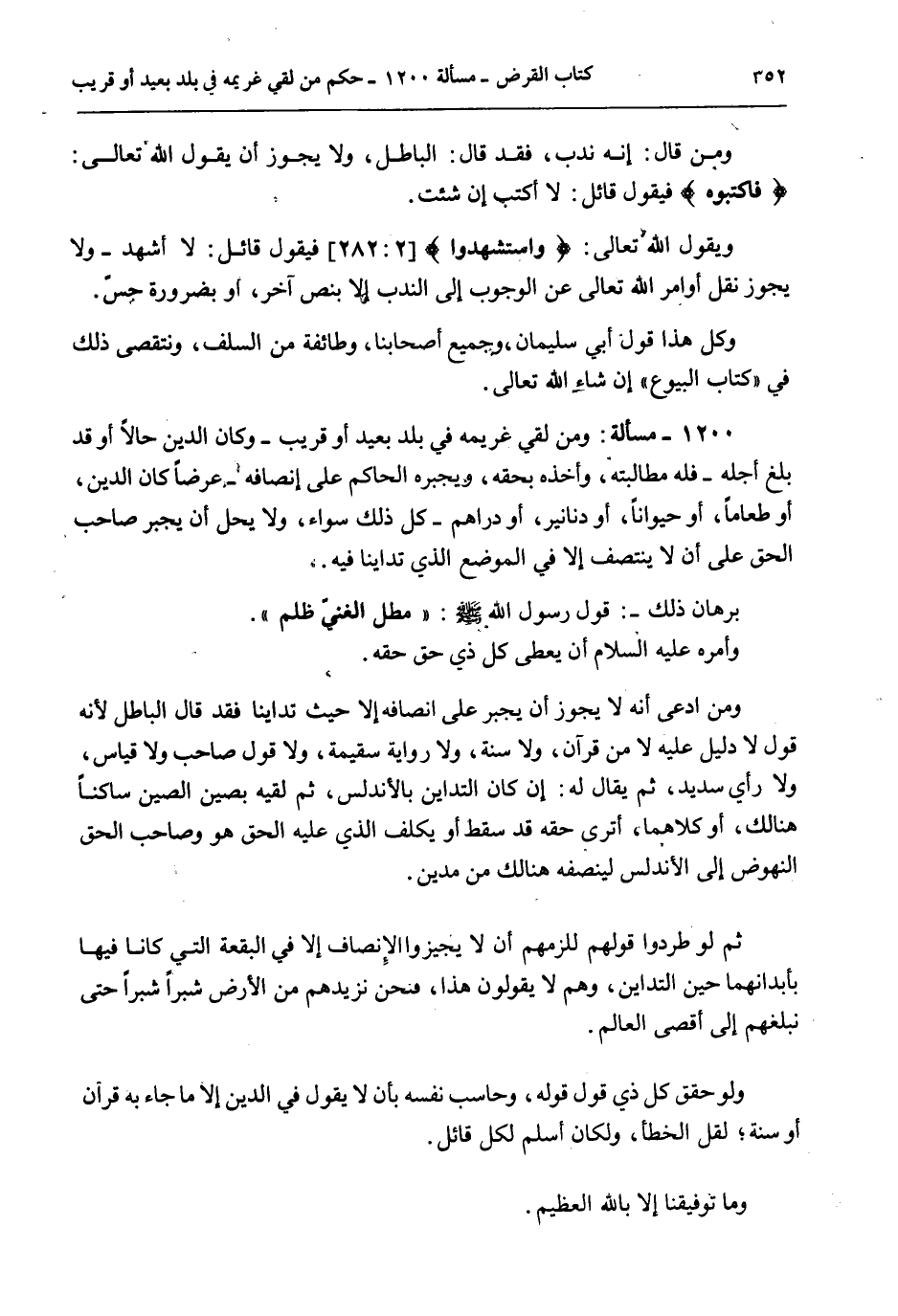 وَمَنْ ادَّعَى أَنَّهُ لَا يَجُوزُ أَنْ يُجْبَرَ عَلَى إنْصَافِهِ إلَّا حَيْثُ تَدَايَنَا فَقَدْ قَالَ الْبَاطِلَ لِأَنَّهُ قَوْلٌ لَا دَلِيلَ عَلَيْهِ لَا مِنْ قُرْآنٍ، وَلَا سُنَّةٍ، وَلَا رِوَايَةٍ سَقِيمَةٍ، وَلَا قَوْلِ صَاحِبٍ وَلَا قِيَاسٍ، وَلَا رَأْيٍ سَدِيدٍ، ثُمَّ يُقَالُ لَهُ: إنْ كَانَ التَّدَايُنُ بِالْأَنْدَلُسِ، ثُمَّ لَقِيَهُ بِصِينِ الصِّينِ سَاكِنًا هُنَالِكَ، أَوْ كِلَاهُمَا، أَتَرَى حَقَّهُ قَدْ سَقَطَ أَوْ يُكَلَّفُ الَّذِي عَلَيْهِ الْحَقُّ هُوَ وَصَاحِبُ الْحَقِّ النُّهُوضَ إلَى الْأَنْدَلُسِ لِيُنْصِفهُ هُنَالِكَ مِنْ مَدِينٍ.