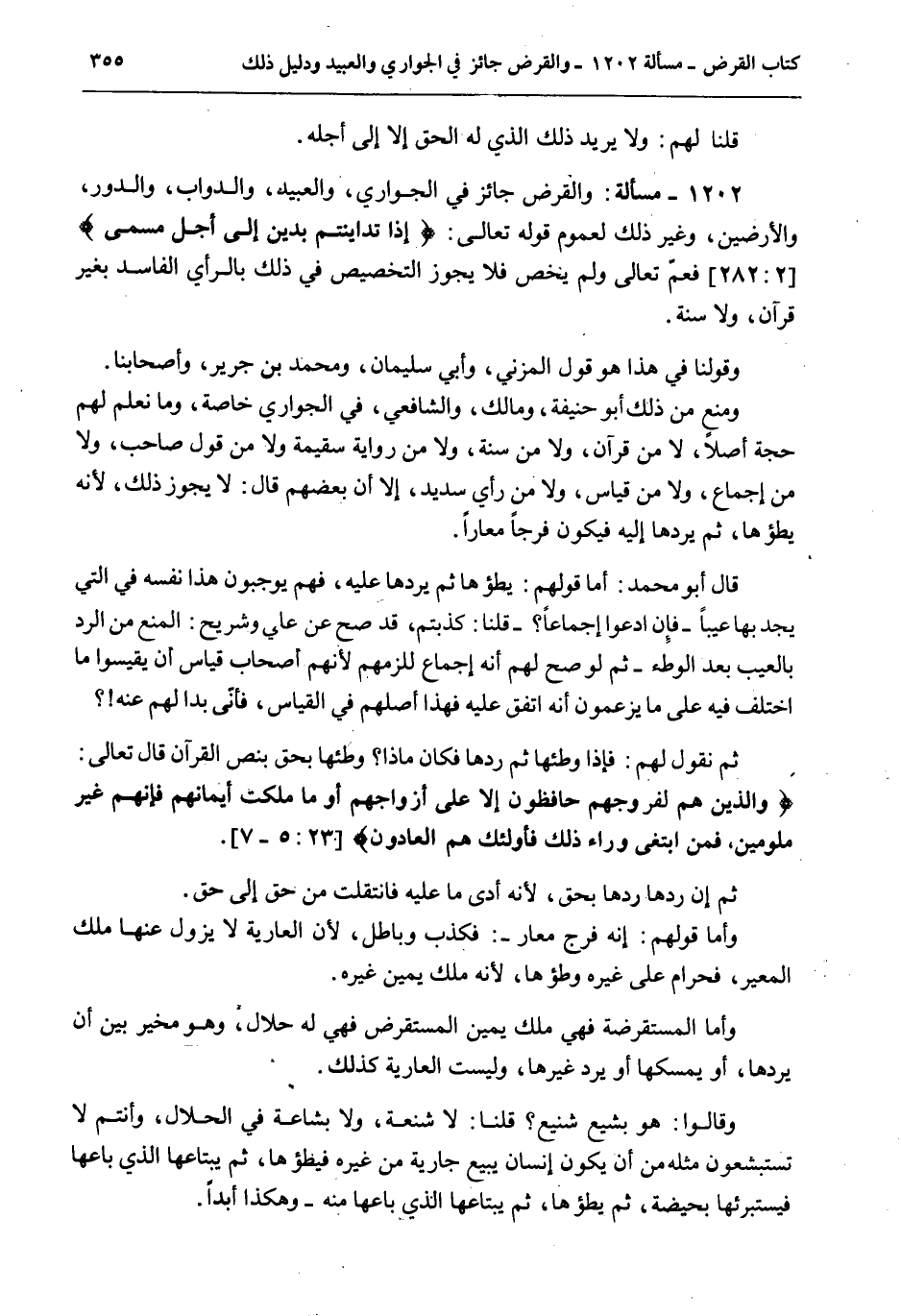 وَالْقَرْضُ جَائِزٌ فِي الْجَوَارِي، وَالْعَبِيدِ، وَالدَّوَابِّ، وَالدُّورِ، وَالْأَرْضِينَ، وَغَيْرِ ذَلِكَ لِعُمُومِ قَوْله تَعَالَى: {إِذَا تَدَايَنْتُمْ بِدَيْنٍ إِلَى أَجَلٍ مُسَمًّى} [البقرة: 282] فَعَمَّ تَعَالَى وَلَمْ يَخُصَّ فَلَا يَجُوزُ التَّخْصِيصُ فِي ذَلِكَ بِالرَّأْيِ الْفَاسِدِ بِغَيْرِ قُرْآنٍ، وَلَا سُنَّةٍ.