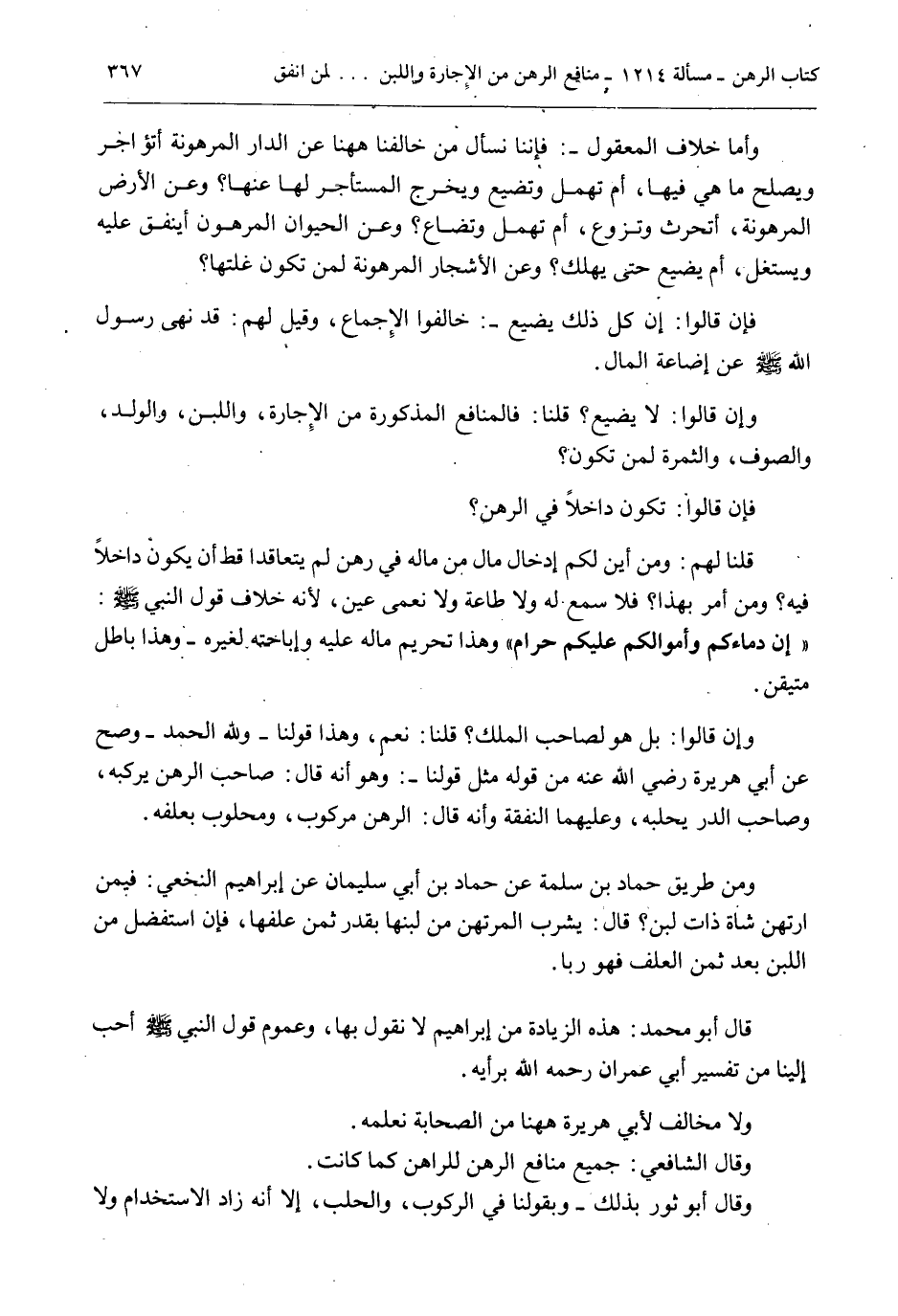 وَإِنْ قَالُوا: لَا يَضِيعُ؟ قُلْنَا: فَالْمَنَافِعُ الْمَذْكُورَةُ مِنْ الْإِجَارَةِ وَاللَّبَنِ، وَالْوَلَدِ، وَالصُّوفِ، وَالثَّمَرَةِ لِمَنْ تَكُونُ؟ فَإِنْ قَالُوا: تَكُونُ دَاخِلًا فِي الرَّهْنِ؟ قُلْنَا لَهُمْ: وَمِنْ أَيْنَ لَكُمْ إدْخَالُ مَالٍ مِنْ مَالِهِ فِي رَهْنٍ لَمْ يَتَعَاقَدَا قَطُّ أَنْ يَكُونَ دَاخِلًا فِيهِ؟ وَمَنْ أَمَرَ بِهَذَا؟ فَلَا سَمْعَ لَهُ وَلَا طَاعَةَ وَلَا نَعْمَى عَيْنٍ، لِأَنَّهُ خِلَافُ قَوْلِ النَّبِيِّ - صَلَّى اللَّهُ عَلَيْهِ وَسَلَّمَ -: «إنَّ دِمَاءَكُمْ وَأَمْوَالَكُمْ عَلَيْكُمْ حَرَامٌ» وَهَذَا تَحْرِيمُ مَالِهِ عَلَيْهِ وَإِبَاحَتُهُ لِغَيْرِهِ - وَهَذَا بَاطِلٌ مُتَيَقَّنٌ.