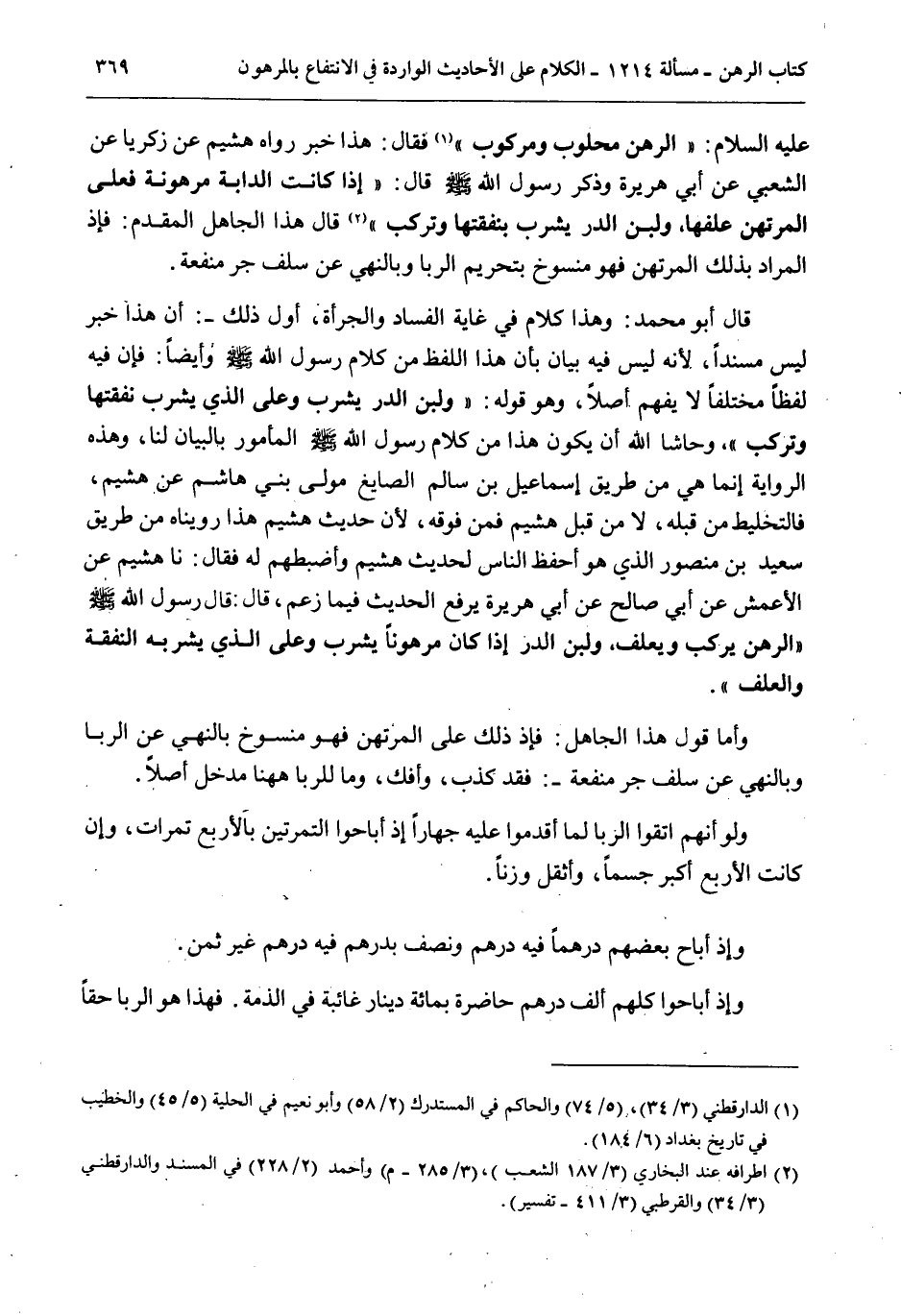 - عَلَيْهِ السَّلَامُ -: «الرَّهْنُ مَحْلُوبٌ وَمَرْكُوبٌ» فَقَالَ: هَذَا خَبَرٌ رَوَاهُ هُشَيْمٌ عَنْ زَكَرِيَّا عَنْ الشَّعْبِيِّ عَنْ أَبِي هُرَيْرَةَ وَذَكَرَ رَسُولُ اللَّهِ - صَلَّى اللَّهُ عَلَيْهِ وَسَلَّمَ - قَالَ: «إذَا كَانَتْ الدَّابَّةُ مَرْهُونَةً فَعَلَى الْمُرْتَهِنِ عَلَفُهَا، وَلَبَنُ الدَّرِّ يُشْرَبُ بِنَفَقَتِهَا وَتُرْكَبُ» قَالَ هَذَا الْجَاهِلُ الْمُقَدَّمُ: فَإِذْ الْمُرَادُ بِذَلِكَ الْمُرْتَهِنُ فَهُوَ مَنْسُوخٌ بِتَحْرِيمِ الرِّبَا وَبِالنَّهْيِ عَنْ سَلَفٍ جَرَّ مَنْفَعَةً.