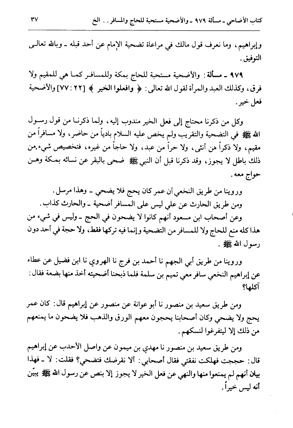 979 - مَسْأَلَةٌ: وَالْأُضْحِيَّةُ مُسْتَحَبَّةٌ لِلْحَاجِّ بِمَكَّةَ وَلِلْمُسَافِرِ كَمَا هِيَ لِلْمُقِيمِ وَلَا فَرْقَ، وَكَذَلِكَ الْعَبْدُ وَالْمَرْأَةُ لِقَوْلِ اللَّهِ تَعَالَى: {وَافْعَلُوا الْخَيْرَ} [الحج: 77] وَالْأُضْحِيَّةُ فِعْلُ خَيْرٍ.