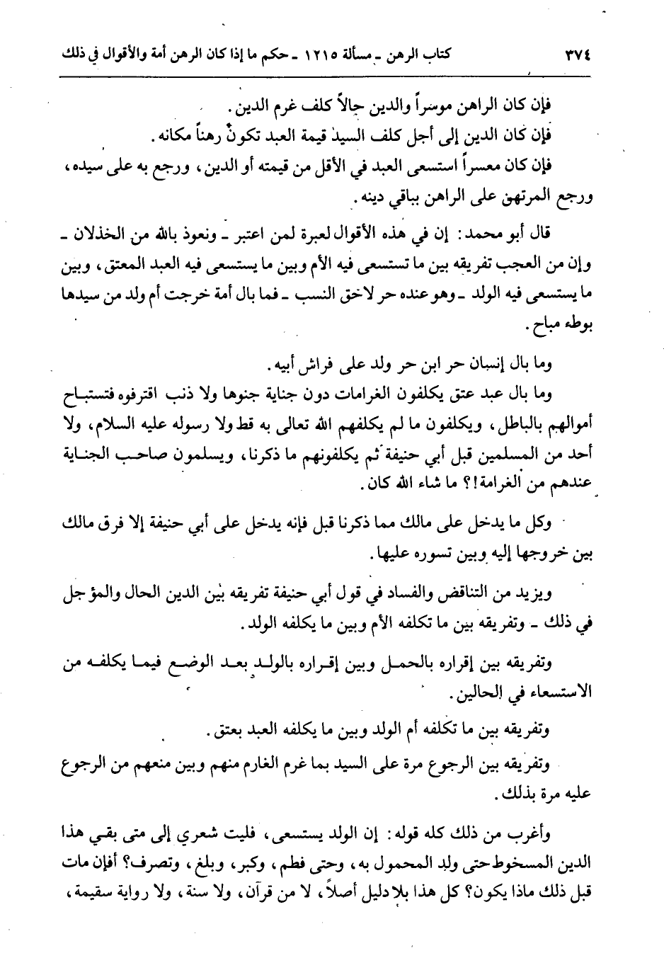 وَيَزِيدُ مِنْ التَّنَاقُضِ وَالْفَسَادِ فِي قَوْلِ أَبِي حَنِيفَةَ تَفْرِيقُهُ بَيْنَ الدَّيْنِ الْحَالِ وَالْمُؤَجَّلِ فِي ذَلِكَ - وَتَفْرِيقُهُ بَيْنَ مَا تُكَلَّفُهُ الْأُمُّ وَبَيْنَ مَا يُكَلَّفُهُ الْوَلَدُ.