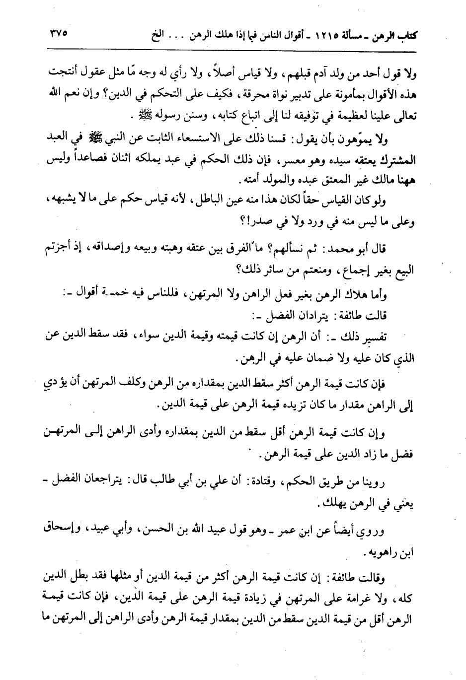 وَلَوْ كَانَ الْقِيَاسُ حَقًّا لَكَانَ هَذَا مِنْهُ عَيْنَ الْبَاطِلِ، لِأَنَّهُ قِيَاسُ حُكْمٍ عَلَى مَا لَا يُشْبِهُهُ، وَعَلَى مَا لَيْسَ مِنْهُ فِي وُرُودٍ وَلَا فِي صَدْرٍ؟ قَالَ أَبُو مُحَمَّدٍ: ثُمَّ نَسْأَلُهُمْ؟ مَا الْفَرْقُ بَيْنَ عِتْقِهِ وَهِبَتِهِ وَبَيْعِهِ وَإِصْدَاقِهِ، إذْ أَجَزْتُمْ الْبَيْعَ بِغَيْرِ إجْمَاعٍ، وَمَنَعْتُمْ مِنْ سَائِرِ ذَلِكَ؟ وَأَمَّا هَلَاكُ الرَّهْنِ بِغَيْرِ فِعْلِ الرَّاهِنِ وَلَا الْمُرْتَهِنِ، فَلِلنَّاسِ فِيهِ خَمْسَةُ أَقْوَالٍ -: قَالَتْ طَائِفَةٌ: يَتَرَادَّانِ الْفَضْلَ -: تَفْسِيرُ ذَلِكَ -: أَنَّ الرَّهْنَ إنْ كَانَتْ قِيمَتُهُ وَقِيمَةُ الدَّيْنِ سَوَاءً، فَقَدْ سَقَطَ الدَّيْنُ عَنْ الَّذِي كَانَ عَلَيْهِ وَلَا ضَمَانَ عَلَيْهِ فِي الرَّهْنِ.