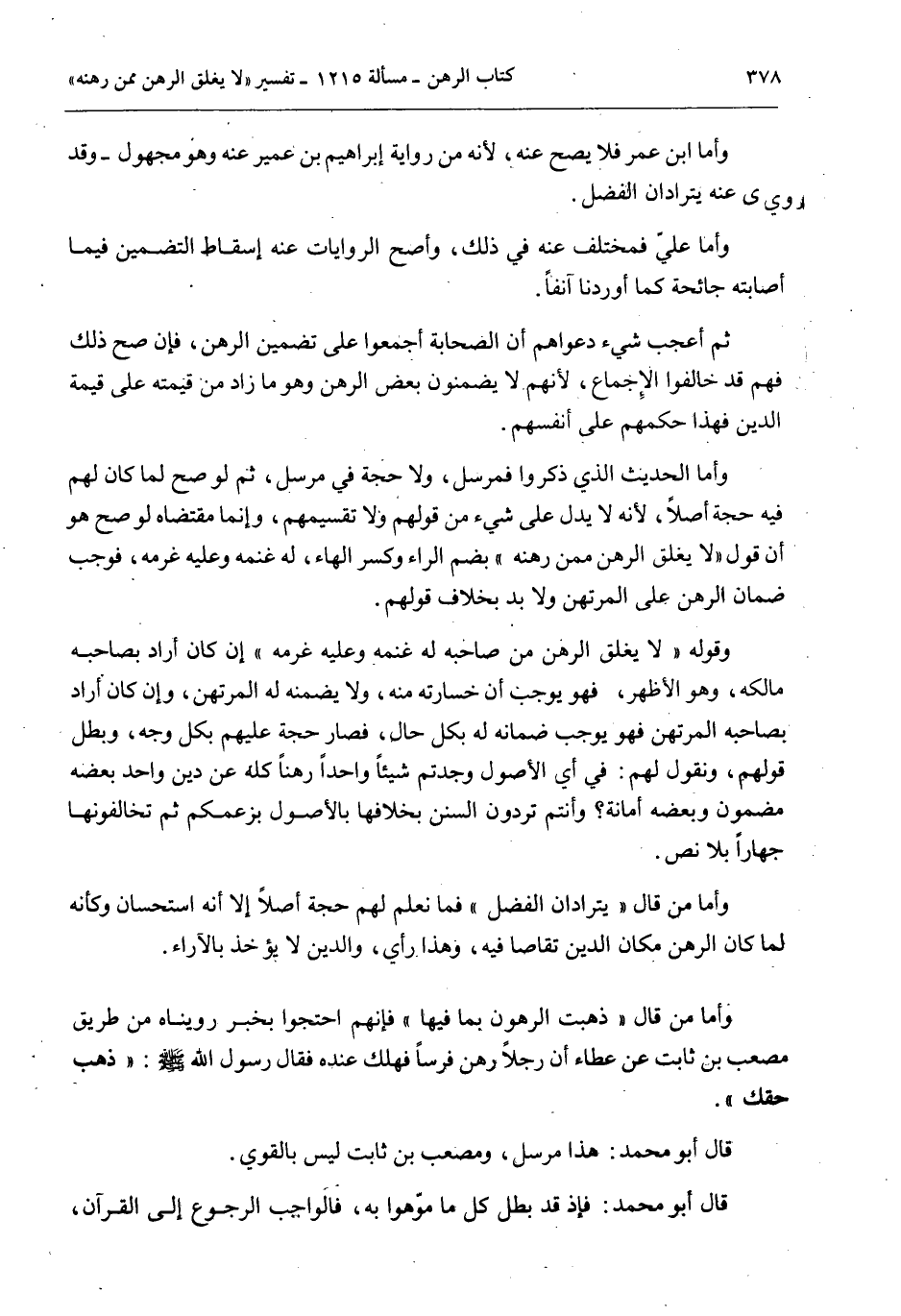 وَأَمَّا الْحَدِيثُ الَّذِي ذَكَرُوا فَمُرْسَلٌ، وَلَا حُجَّةَ فِي مُرْسَلٍ، ثُمَّ لَوْ صَحَّ لَمَا كَانَ لَهُمْ فِيهِ حُجَّةٌ أَصْلًا، لِأَنَّهُ لَا يَدُلُّ عَلَى شَيْءٍ مِنْ قَوْلِهِمْ وَلَا تَقْسِيمِهِمْ، وَإِنَّمَا مُقْتَضَاهُ لَوْ صَحَّ هُوَ أَنَّ قَوْلَ «لَا يُغْلَقُ الرَّهْنُ مِمَّنْ رُهِنَهُ» بِضَمِّ الرَّاءِ وَكَسْرِ الْهَاءِ، لَهُ غُنْمُهُ وَعَلَيْهِ غُرْمُهُ، فَوَجَبَ ضَمَانُ الرَّهْنِ عَلَى الْمُرْتَهِنِ وَلَا بُدَّ بِخِلَافِ قَوْلِهِمْ.