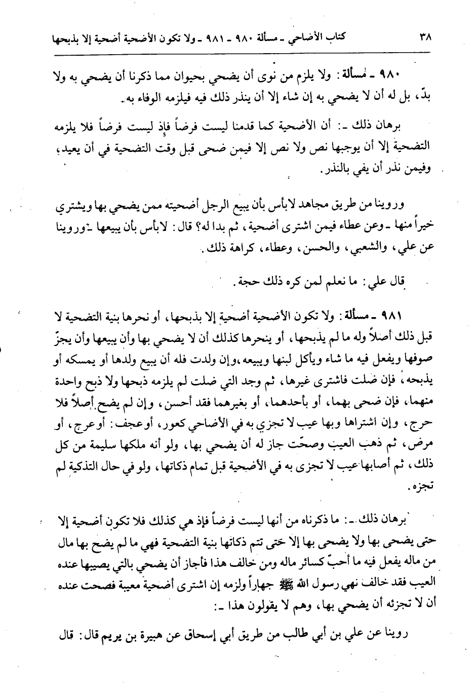 بُرْهَانُ ذَلِكَ -: مَا ذَكَرْنَاهُ مِنْ أَنَّهَا لَيْسَتْ فَرْضًا فَإِذْ هِيَ كَذَلِكَ فَلَا تَكُونُ أُضْحِيَّةً إلَّا حَتَّى يُضَحِّيَ بِهَا وَلَا يُضَحِّيَ بِهَا إلَّا حَتَّى تَتِمَّ ذَكَاتُهَا بِنِيَّةِ التَّضْحِيَةِ فَهِيَ مَا لَمْ يُضَحِّ بِهَا مَالٌ مِنْ مَالِهِ يَفْعَلُ فِيهِ مَا أَحَبَّ كَسَائِرِ مَالِهِ وَمَنْ خَالَفَ هَذَا فَأَجَازَ أَنْ يُضَحِّيَ بِاَلَّتِي يُصِيبُهَا عِنْدَهُ الْعَيْبُ فَقَدْ خَالَفَ نَهْيَ رَسُولِ اللَّهِ - صَلَّى اللَّهُ عَلَيْهِ وَسَلَّمَ - جَهَارًا وَلَزِمَهُ إنْ اشْتَرَى أُضْحِيَّةً مَعِيبَةً فَصَحَّتْ عِنْدَهُ أَنْ لَا تُجْزِئَهُ أَنْ يُضَحِّيَ بِهَا، وَهُمْ لَا يَقُولُونَ هَذَا -: رُوِّينَا عَنْ عَلِيِّ بْنِ أَبِي طَالِبٍ مِنْ طَرِيقِ أَبِي إِسْحَاقَ عَنْ هُبَيْرَةَ بْنِ يَرِيمَ قَالَ: قَالَ