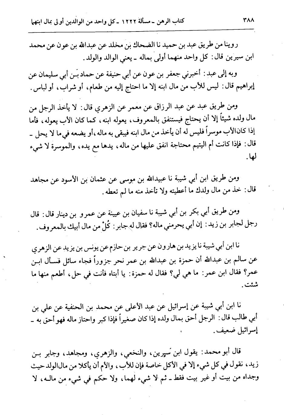 وَمِنْ طَرِيقِ ابْنِ أَبِي شَيْبَةَ نا عُبَيْدُ اللَّهِ بْنُ مُوسَى عَنْ عُثْمَانَ بْنِ الْأَسْوَدِ عَنْ مُجَاهِدٍ قَالَ: خُذْ مِنْ مَالِ وَلَدِك مَا أَعْطَيْته وَلَا تَأْخُذْ مِنْهُ مَا لَمْ تُعْطِهِ وَمِنْ طَرِيقِ أَبِي بَكْرِ بْنِ أَبِي شَيْبَةَ نا سُفْيَانُ بْنُ عُيَيْنَةَ عَنْ عَمْرِو بْنِ دِينَارٍ قَالَ: قَالَ رَجُلٌ لِجَابِرِ بْنِ زَيْدٍ: إنَّ أَبِي يَحْرِمْنِي مَالَهُ؟ فَقَالَ لَهُ جَابِرٌ: كُلْ مَنْ مَالِ أَبِيك بِالْمَعْرُوفِ. نا ابْنُ أَبِي شَيْبَةَ نا يَزِيدُ بْنُ هَارُونَ عَنْ جَرِيرِ بْنِ حَازِمٍ عَنْ يُونُسَ بْنِ يَزِيدَ عَنْ الزُّهْرِيِّ عَنْ سَالِمِ بْنِ عَبْدِ اللَّهِ أَنَّ حَمْزَةَ بْنَ عَبْدِ اللَّهِ بْنِ عُمَرَ نَحَرَ جَزُورًا فَجَاءَ سَائِلٌ فَسَأَلَ ابْنَ عُمَرَ؟ فَقَالَ ابْنُ عُمَرَ: مَا هِيَ لِي؟ فَقَالَ لَهُ حَمْزَةُ: يَا أَبَتَاهُ فَأَنْتَ فِي حِلٍّ، أَطْعِمْ مِنْهَا مَا شِئْت.