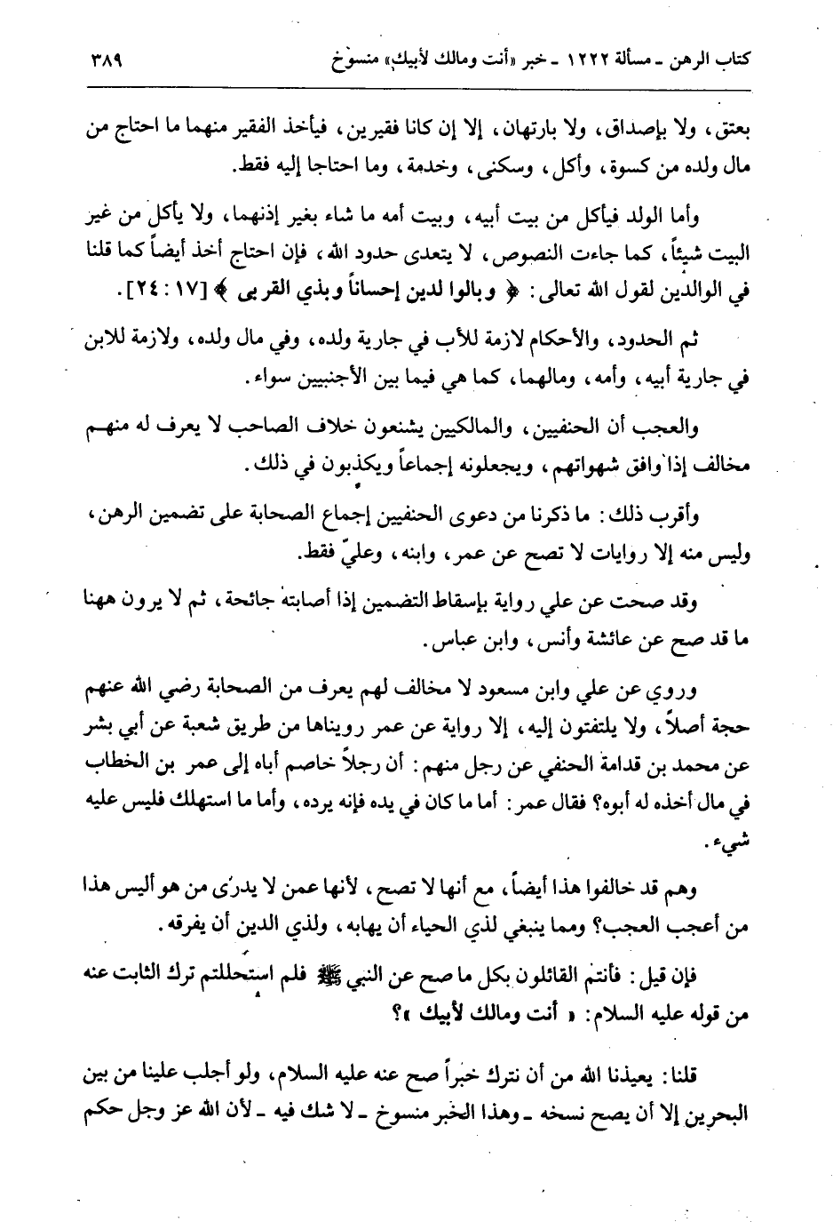 وَهُمْ قَدْ خَالَفُوا هَذَا أَيْضًا، مَعَ أَنَّهَا لَا تَصِحُّ، لِأَنَّهَا عَمَّنْ لَا يَدْرِي مَنْ هُوَ أَلَيْسَ هَذَا مِنْ أَعْجَبْ الْعَجَبِ؟ وَمِمَّا يَنْبَغِي لِذِي الْحَيَاءِ أَنْ يَهَابَهُ، وَلِذِي الدِّينِ أَنْ يُفَرِّقَهُ. فَإِنَّ قِيلَ: فَأَنْتُمْ الْقَائِلُونَ بِكُلِّ مَا صَحَّ عَنْ النَّبِيِّ - صَلَّى اللَّهُ عَلَيْهِ وَسَلَّمَ - فَلِمَ اسْتَحْلَلْتُمْ تَرْكَ الثَّابِتِ عَنْهُ مِنْ قَوْلِهِ - عَلَيْهِ السَّلَامُ -: «أَنْتَ وَمَالُكَ لِأَبِيكَ» ؟ قُلْنَا: يُعِيذُنَا اللَّهُ مِنْ أَنْ نَتْرُكَ خَبَرًا صَحَّ عَنْهُ - عَلَيْهِ السَّلَامُ -، وَلَوْ أُجْلِبُ عَلَيْنَا مِنْ بَيْنِ الْبَحْرَيْنِ إلَّا أَنْ يَصِحَّ نَسْخُهُ - وَهَذَا الْخَبَرُ مَنْسُوخٌ - لَا شَكَّ فِيهِ - لِأَنَّ اللَّهَ عَزَّ وَجَلَّ حَكَمَ