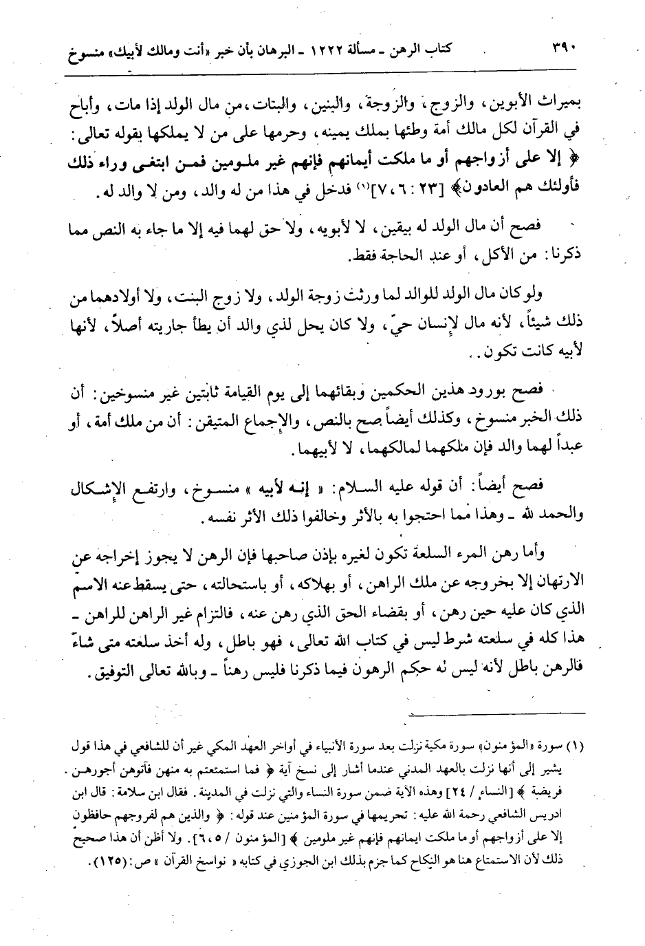 فَصَحَّ بِوُرُودِ هَذَيْنِ الْحُكْمَيْنِ وَبَقَائِهِمَا إلَى يَوْمِ الْقِيَامَةِ ثَابِتَيْنِ غَيْرِ مَنْسُوخَيْنِ: أَنَّ ذَلِكَ الْخَبَرُ مَنْسُوخٌ، وَكَذَلِكَ أَيْضًا صَحَّ بِالنَّصِّ، وَالْإِجْمَاعِ الْمُتَيَقَّنِ: أَنَّ مَنْ مَلَكَ أَمَةً، أَوْ عَبْدًا لَهُمَا وَالِدٌ فَإِنَّ مِلْكَهُمَا لِمَالِكِهِمَا، لَا لِأَبِيهِمَا.