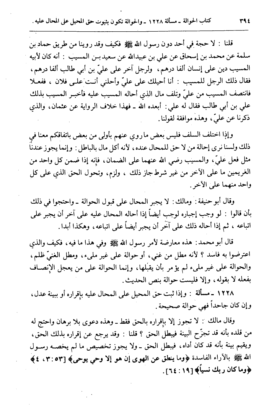 قُلْنَا: لَا حُجَّةَ فِي أَحَدٍ دُونَ رَسُولِ اللَّهِ - صَلَّى اللَّهُ عَلَيْهِ وَسَلَّمَ - فَكَيْفَ وَقَدْ رُوِّينَا مِنْ طَرِيقِ حَمَّادِ بْنِ سَلَمَةَ عَنْ مُحَمَّدِ بْنِ إِسْحَاقَ عَنْ عَلِيِّ بْنِ عُبَيْدِ اللَّهِ عَنْ سَعِيدِ بْنِ الْمُسَيِّبِ: أَنَّهُ كَانَ لِأَبِيهِ الْمُسَيِّبِ دَيْنٌ عَلَى إنْسَانٍ أَلْفَا دِرْهَمٍ، وَلِرَجُلِ آخَر عَلَى عَلِيِّ بْنِ أَبِي طَالِبٍ أَلْفَا دِرْهَمٍ، فَقَالَ ذَلِكَ الرَّجُلُ لِلْمُسَيِّبِ: أَنَا أُحِيلُك عَلَى عَلِيٍّ وَأَحِلْنِي أَنْتَ عَلَى فُلَانٍ، فَفَعَلَا فَانْتَصَفَ الْمُسَيِّبُ مِنْ عَلِيٍّ وَتَلِفَ مَالُ الَّذِي أَحَالَهُ الْمُسَيِّبُ عَلَيْهِ فَأَخْبَرَ الْمُسَيِّبُ بِذَلِكَ عَلِيَّ بْنَ أَبِي طَالِبٍ فَقَالَ لَهُ عَلِيٌّ: أَبْعَدَهُ اللَّهُ - فَهَذَا خِلَافُ الرِّوَايَةِ عَنْ عُثْمَانَ، وَاَلَّذِي ذَكَرْنَا عَنْ عَلِيٍّ، وَهَذِهِ مُوَافِقَةٌ لِقَوْلِنَا.