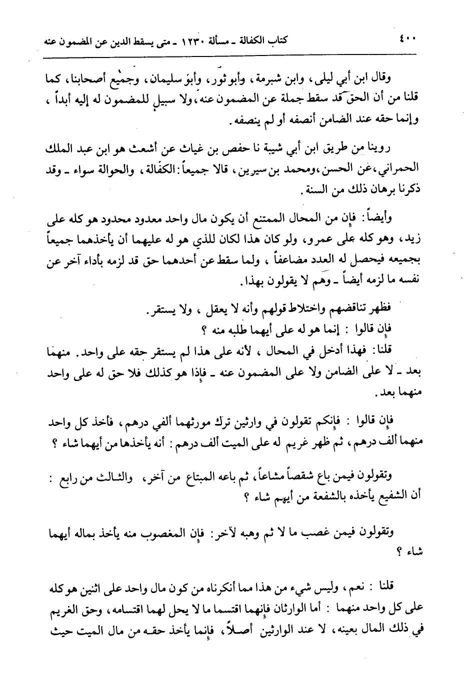 وَأَيْضًا: فَإِنَّ مِنْ الْمُحَالِ الْمُمْتَنِعِ أَنْ يَكُونَ مَالُ وَاحِدٍ مَعْدُودٍ مَحْدُودٍ هُوَ كُلَّهُ عَلَى زَيْدٍ، وَهُوَ كُلُّهُ عَلَى عَمْرٍو، وَلَوْ كَانَ هَذَا لَكَانَ لِلَّذِي هُوَ لَهُ عَلَيْهِمَا أَنْ يَأْخُذَهُمَا جَمِيعًا بِجَمِيعِهِ فَيَحْصُلُ لَهُ الْعَدَدُ مُضَاعَفًا، وَلَمَا سَقَطَ عَنْ أَحَدِهِمَا حَقٌّ قَدْ لَزِمَهُ بِأَدَاءِ آخَرَ عَنْ نَفْسِهِ مَا لَزِمَهُ أَيْضًا - وَهُمْ لَا يَقُولُونَ بِهَذَا.