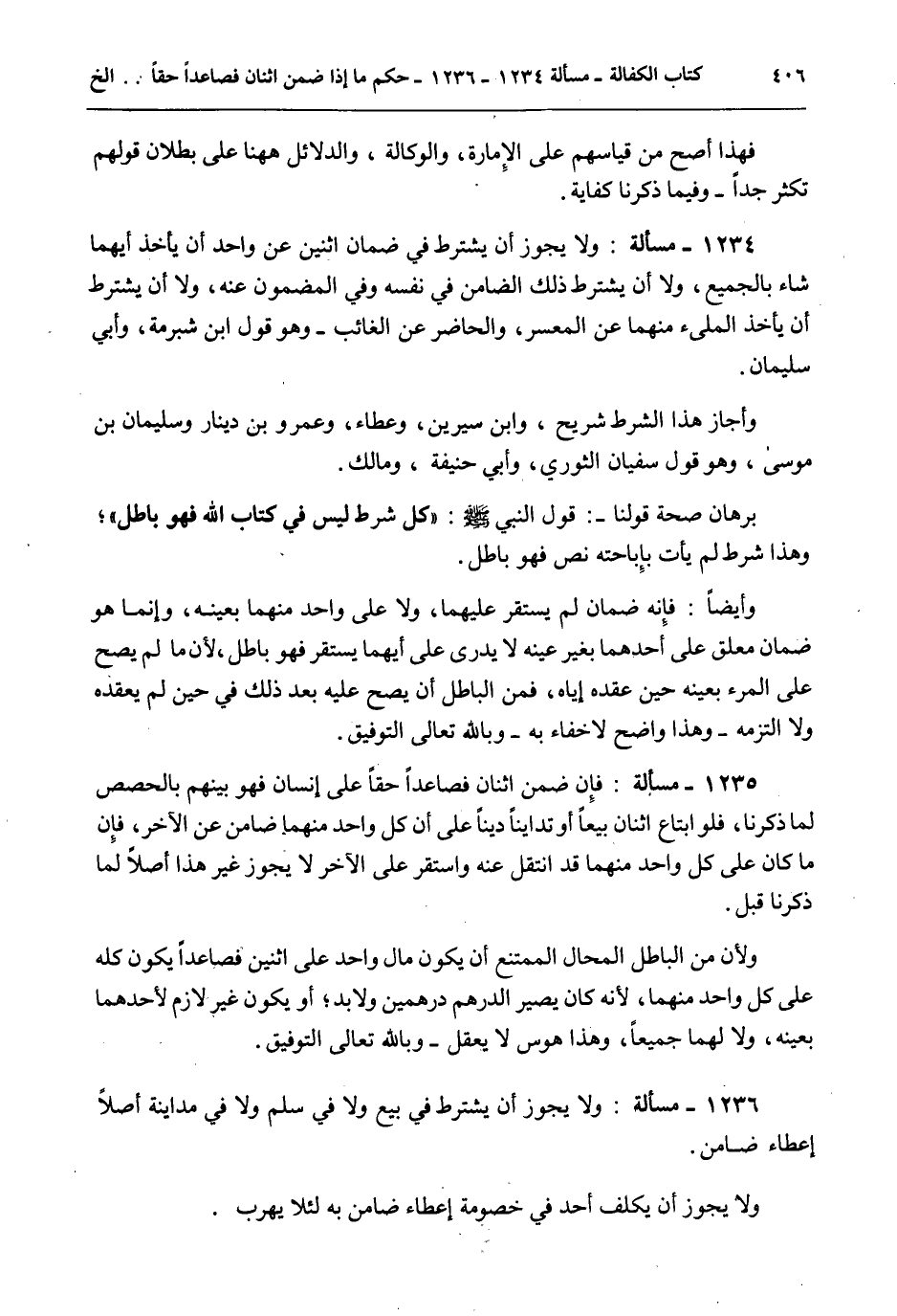 وَلِأَنَّ مِنْ الْبَاطِلِ الْمُحَالِ الْمُمْتَنِعِ أَنْ يَكُونَ مَالُ وَاحِدٍ عَلَى اثْنَيْنِ فَصَاعِدًا يَكُونُ كُلُّهُ عَلَى كُلِّ وَاحِدٍ مِنْهُمَا، لِأَنَّهُ كَانَ يُصَيِّرُ الدِّرْهَمُ دِرْهَمَيْنِ وَلَا بُدَّ؛ أَوْ يَكُونَ غَيْرَ لَازِمٍ لِأَحَدِهِمَا بِعَيْنِهِ، وَلَا لَهُمَا جَمِيعًا، وَهَذَا هَوَسٌ لَا يُعْقَلُ - وَبِاَللَّهِ تَعَالَى التَّوْفِيقُ.