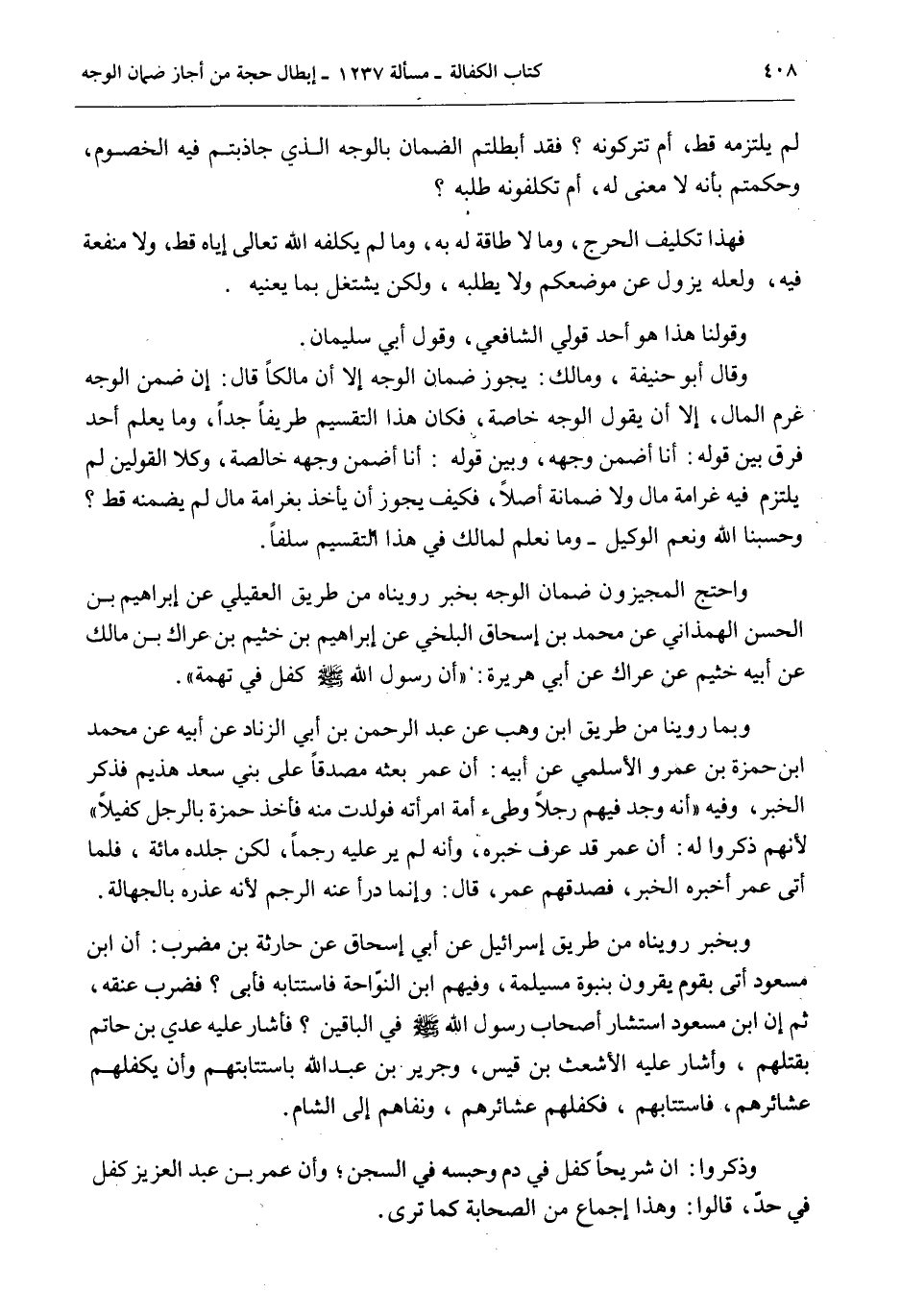 وَاحْتَجَّ الْمُجِيزُونَ ضَمَانَ الْوَجْهِ بِخَبَرٍ رُوِّينَاهُ مِنْ طَرِيقِ الْعُقَيْلِيِّ عَنْ إبْرَاهِيمَ بْنِ الْحَسَنِ الْهَمَذَانِيِّ عَنْ مُحَمَّدِ بْنِ إِسْحَاقَ الْبَلْخِيّ عَنْ إبْرَاهِيمَ بْنِ خُثَيْمَ بْنِ عِرَاكِ بْنِ مَالِكٍ عَنْ أَبِيهِ خُثَيْمَ عَنْ عِرَاكٍ عَنْ أَبِي هُرَيْرَةَ: «أَنَّ رَسُولَ اللَّهِ - صَلَّى اللَّهُ عَلَيْهِ وَسَلَّمَ - كَفَلَ فِي تُهْمَةٍ» . وَبِمَا رُوِّينَا مِنْ طَرِيقِ ابْنِ وَهْبٍ عَنْ عَبْدِ الرَّحْمَنِ بْنِ أَبِي الزِّنَادِ عَنْ أَبِيهِ عَنْ مُحَمَّدِ بْنِ حَمْزَةَ بْنِ عَمْرٍو الْأَسْلَمِيِّ عَنْ أَبِيهِ: أَنَّ عُمَرَ بَعَثَهُ مُصَدِّقًا عَلَى بَنِي سَعْدِ هُذَيْمٍ فَذَكَرَ الْخَبَرَ، وَفِيهِ " أَنَّهُ وَجَدَ فِيهِمْ رَجُلًا وَطِئَ أَمَةَ امْرَأَتِهِ فَوَلَدَتْ مِنْهُ فَأَخَذَ حَمْزَةُ بِالرَّجُلِ كَفِيلًا " لِأَنَّهُمْ ذَكَرُوا لَهُ: أَنَّ عُمَرَ قَدْ عَرَفَ خَبَرَهُ، وَأَنَّهُ لَمْ يَرَ عَلَيْهِ رَجْمًا، لَكِنْ جَلَدَهُ مِائَةً، فَلَمَّا أَتَى عُمَرَ أَخْبَرَهُ الْخَبَرَ، فَصَدَّقَهُمْ عُمَرُ، قَالَ: وَإِنَّمَا دَرَأَ عَنْهُ الرَّجْمَ لِأَنَّهُ عَذَرَهُ بِالْجَهَالَةِ.