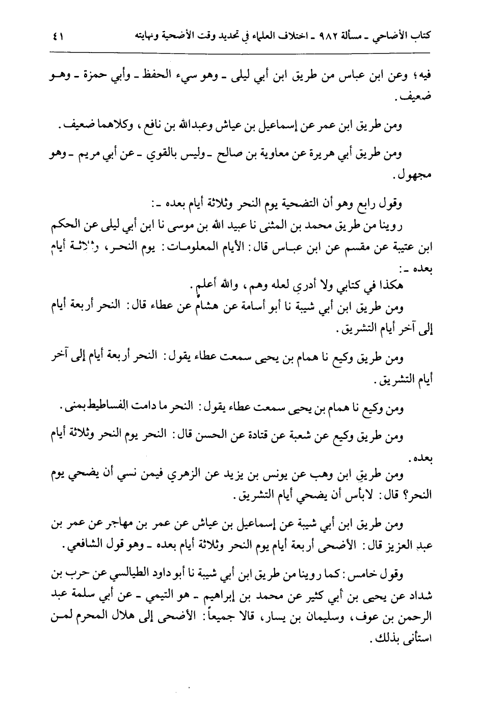 وَقَوْلٌ رَابِعٌ وَهُوَ أَنَّ التَّضْحِيَةَ يَوْمُ النَّحْرِ وَثَلَاثَةُ أَيَّامٍ بَعْدَهُ -: رُوِّينَا مِنْ طَرِيقِ مُحَمَّدِ بْنِ الْمُثَنَّى نَا عُبَيْدُ اللَّهِ بْنُ مُوسَى نَا ابْنُ أَبِي لَيْلَى عَنْ الْحَكَمِ بْنِ عُتَيْبَةَ عَنْ مِقْسَمٍ عَنْ ابْنِ عَبَّاسٍ قَالَ: الْأَيَّامُ الْمَعْلُومَاتُ: يَوْمُ النَّحْرِ، وَثَلَاثَةُ أَيَّامٍ بَعْدَهُ -: هَكَذَا فِي كِتَابِي وَلَا أَدْرِي لَعَلَّهُ وَهْمٌ، وَاَللَّهُ أَعْلَمُ.