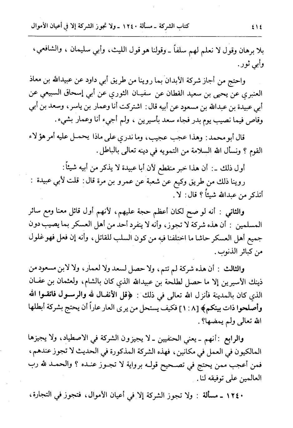 وَالثَّالِثُ: أَنَّ هَذِهِ شَرِكَةٌ لَمْ تَتِمَّ، وَلَا حَصَلَ لِسَعْدٍ وَلَا لِعَمَّارٍ، وَلَا لِابْنِ مَسْعُودٍ مِنْ ذَيْنِكَ الْأَسِيرَيْنِ إلَّا مَا حَصَلَ لِطَلْحَةَ بْنِ عُبَيْدِ اللَّهِ الَّذِي كَانَ بِالشَّامِ، وَلِعُثْمَانَ بْنِ عَفَّانَ الَّذِي كَانَ بِالْمَدِينَةِ فَأَنْزَلَ اللَّهُ تَعَالَى فِي ذَلِكَ: {قُلِ الأَنْفَالُ لِلَّهِ وَالرَّسُولِ فَاتَّقُوا اللَّهَ وَأَصْلِحُوا ذَاتَ بَيْنِكُمْ} [الأنفال: 1] فَكَيْف يَسْتَحِلُّ مَنْ يَرَى الْعَارَ عَارًا أَنْ يَحْتَجَّ بِشَرِكَةٍ أَبْطَلَهَا اللَّهُ تَعَالَى وَلَمْ يَمْضِهَا؟ .