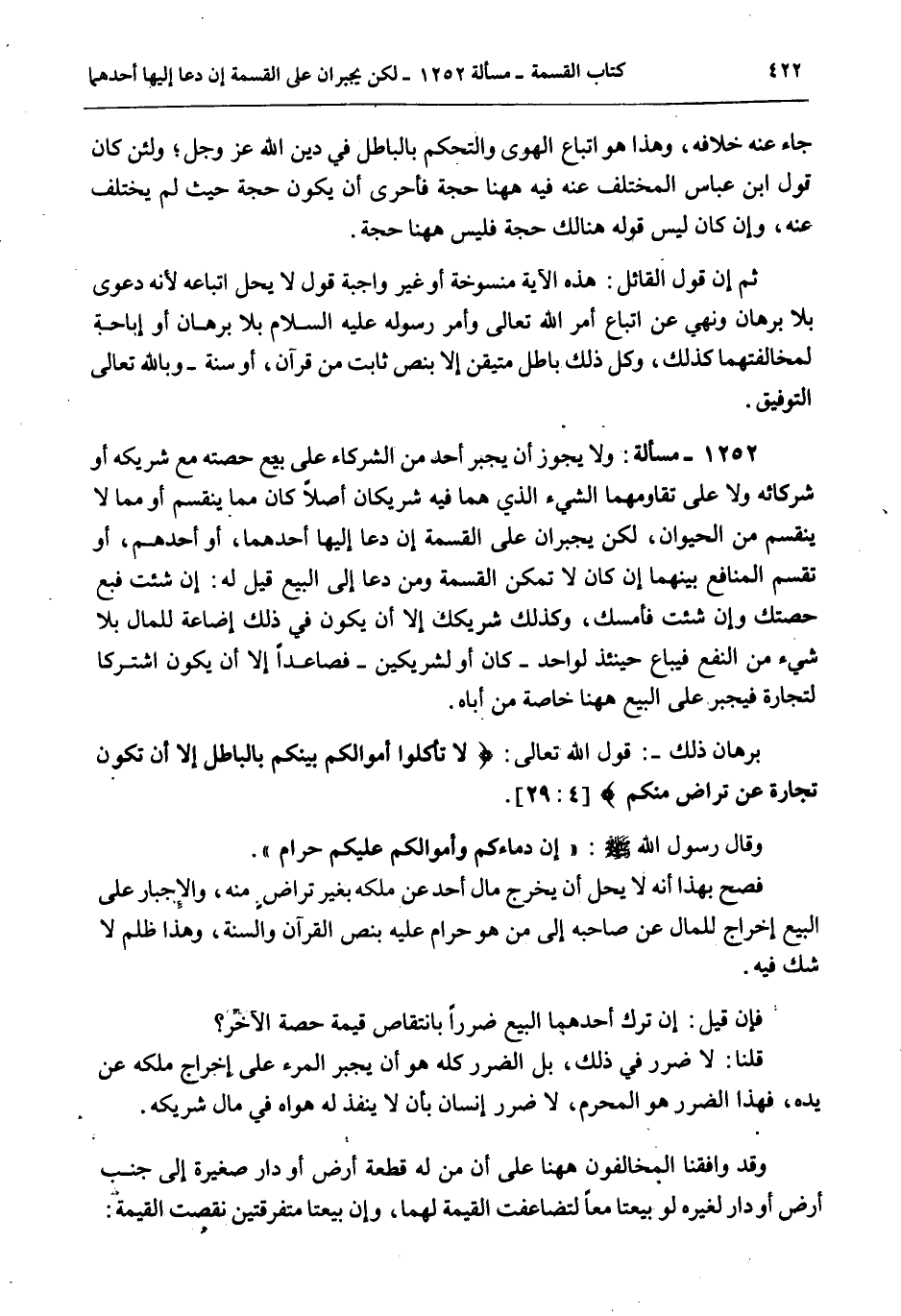 فَإِنْ قِيلَ: إنَّ تَرْكَ أَحَدِهِمَا الْبَيْعَ ضَرَرًا بِانْتِقَاصِ قِيمَةِ حِصَّةِ الْآخَرِ؟ قُلْنَا: لَا ضَرَرَ فِي ذَلِكَ، بَلْ الضَّرَرُ كُلُّهُ هُوَ أَنْ يُجْبَرَ الْمَرْءُ عَلَى إخْرَاجِ مِلْكِهِ عَنْ يَدِهِ، فَهَذَا الضَّرَرُ هُوَ الْمُحَرَّمُ، لَا ضَرَرُ إنْسَانٍ بِأَنْ لَا يُنَفِّذَ لَهُ هَوَاهُ فِي مَالِ شَرِيكِهِ.