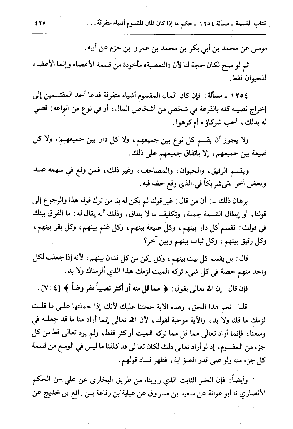 بُرْهَانُ ذَلِكَ -: أَنَّ مَنْ قَالَ غَيْرَ قَوْلِنَا لَمْ يَكُنْ لَهُ بُدٌّ مِنْ تَرْكِ قَوْلِهِ هَذَا وَالرُّجُوعِ إلَى قَوْلِنَا، أَوْ إبْطَالِ الْقِسْمَةِ جُمْلَةً، وَتَكْلِيفُ مَا لَا يُطَاقُ، وَذَلِكَ أَنَّهُ يُقَالُ لَهُ: مَا الْفَرْقُ بَيْنَك فِي قَوْلِك: تُقْسَمُ كُلُّ دَارٍ بَيْنَهُمْ، وَكُلُّ ضَيْعَةٍ بَيْنَهُمْ، وَكُلُّ غَنَمٍ بَيْنَهُمْ، وَكُلُّ بَقَرٍ بَيْنَهُمْ، وَكُلُّ رَقِيقٍ بَيْنَهُمْ، وَكُلُّ ثِيَابٍ بَيْنَهُمْ وَبَيْنَ آخَرَ؟ قَالَ: بَلْ يُقْسَمُ كُلُّ بَيْتٍ بَيْنَهُمْ، وَكُلُّ رُكْنٍ مِنْ كُلِّ فَدَّانٍ بَيْنَهُمْ، لِأَنَّهُ إذَا جَعَلْتَ لِكُلِّ وَاحِدٍ مِنْهُمْ حِصَّةً فِي كُلِّ شَيْءٍ تَرَكَهُ الْمَيِّتُ لَزِمَك هَذَا الَّذِي أَلْزَمْنَاك وَلَا بُدَّ.